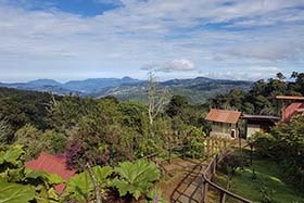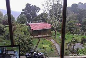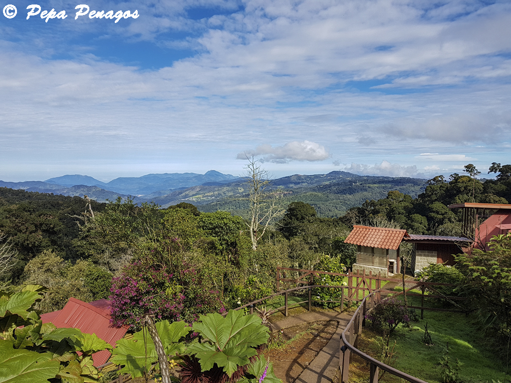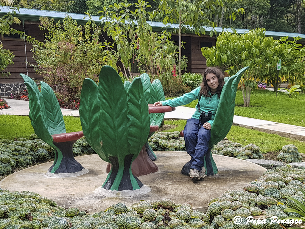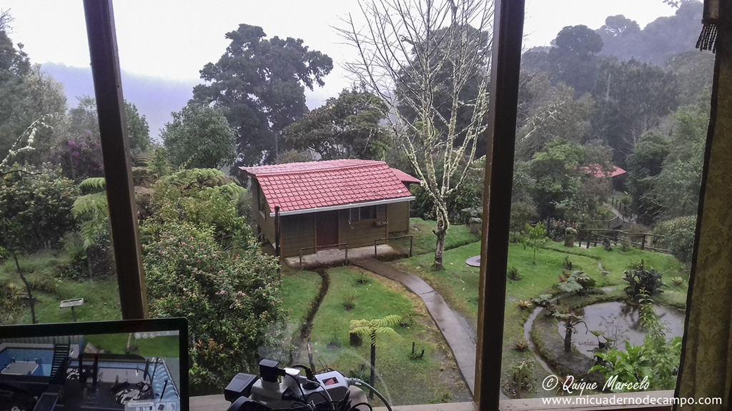 Me levanté a las 5:30 horas, un café rápido, y mientras las chicas se levantaban, salí de la habitación y me puse a buscar bichos. Recorrí un sendero por detrás del lodge donde me dijeron que podría encontrar algún pájaro interesante, Allí, encontré un Sinsonte tropical (Mimus gilvus), y también Saltón gargantillo (Buarremon brunneinucha), Zorzal plebeyo (Turdus plebejus), Zorzalito de Frantzius (Catharus frantzii), Capulinero colilargo (Ptilogonys caudatus), etc. Mas tarde, sobre las 7:30, fui a buscar a las chicas y nos fuimos a desayunar al restaurante del lodge. Nada más terminar hicimos las maletas, ya que, hoy dejábamos aquel lugar mágico que era el Río Savegre para dirigirnos a Paraíso Quetzal, a pocos kilómetros de allí, pero a bastante más altura. Llegamos pronto a Paraíso Quetzal y la habitación no estaba preparada, con lo cual, hasta que nos la dieron estuvimos fotografiando colibríes en los comederos. La actividad en los comederos era extremadamente alta. Allí había colibríes por todos lados, entre los que destacaba el endémico Colibrí insigne (Panterpe insignis), un colibrí que según como le incida la luz, su garganta adquiere un tono fuego muy llamativo, realmente bonito. Otros colibríes que acuden a esos comederos son Colibrí magnífico (Eugenes fulgens). Chispita volcanera (Selasphorus flammula) y Colibrí verdemar (Colibri thalassinus). Al poco tiempo, nos dan la habitación y nos acomodamos en una bonita cabina en lo alto de una ladera, con un ventanal en el que puedes ver desde un punto bastante alto el jardín que tienes abajo y un bosque lluvioso que se extiende hasta donde llega la vista, una virguería de sitio. Sobre las 12:30 nos vamos a comer a una soda que hay en la carretera y al volver, como todas las tardes en esta zona del país, nos llueve a cantaros. Cuando llegamos a la zona de habitaciones, entramos en nuestra cabina y sigue lloviendo bastante. Nuestra esperanza de que pare es escasa, el cielo está bastante encapotado y no tiene pinta que vaya a parar, pero nuestro ventanal nos da la oportunidad de disfrutar de toda la fauna que pasa por allí, y no es poca. Mientras las chicas descansan yo veo desde el ventanal Candelita collareja (Myioborus torquatus), Chingolo común (Zonotrichia capensis), Zorzalito piquinegro (Catharus gracilirostris) (endémico), Cerquero musliamarillo (Pselliophorus tibialis), Mosquero amarillento (Empidonax flavescens), etc. La suerte cambia y veo que sobre las 16:00 horas para de llover, situación que no desaprovecho y salgo fuera a darme una vuelta. La verdad que los pájaros están muy activos después del chaparrón. En primer lugar, encuentro una pareja de pícidos pequeños que están muy atareados buscando alimento por el suelo. Mirando en la guía, veo que se trata de Pico velloso (Picoides villosus), además también disfruto mucho con un grupo de Clorofonia cejidorada (Chlorophonia callophrys) y Cerquero patilargo (Pezopetes capitalis). Ya con el día prácticamente terminado, vamos a cenar al restaurante del lodge y pronto vamos a dormir. |