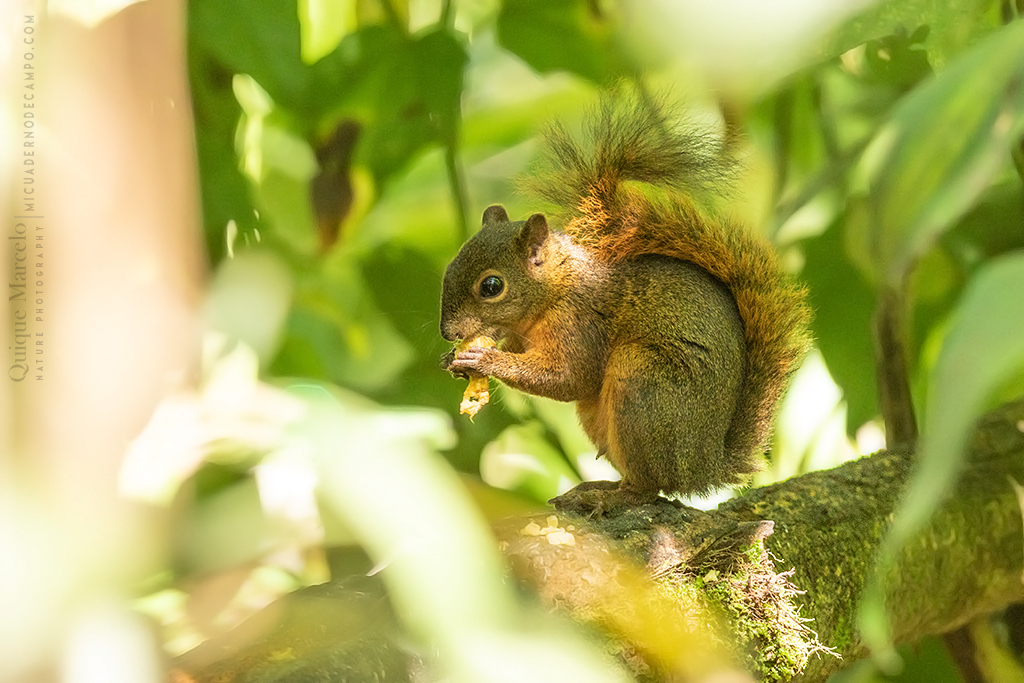 Quedaba todavía alguna hora para amanecer cuando sonó el despertador. Hoy Alex vendrá nuevamente muy temprano a buscarme para acometer nuestro último día en Ecuador visitando Sachatamia Lodge, al norte de Mindo. Sachatamia es un lugar excelente para fotografiar aves, ya que cuenta con un hide iluminado para atraer insectos, lo que a su vez atrae a las aves, además de varios comederos para colibríes y otros pájaros. Después de tomar un rápido café en nuestro lodge, salí de nuestra habitación y encontré a Alex esperándome. Sin más demora, nos dirigimos hacia Sachatamia. Al llegar, todavía casi de noche, nos dirigimos al mencionado hide con luz para insectos. La verdad, no defrauda; enseguida empezamos a ver especies interesantes como Candelita plomiza (Myioborus miniatus), Mosquerito ardonado (Myiotriccus ornatus) y un precioso y llamativo Momoto yerubá occidental (Baryphthengus martii) que se alimentaba de los insectos de mayor tamaño. Me percaté de que en uno de los posaderos había colgado un racimo de uvas y le pregunté a Alex para qué especie era. Me respondió que era para una hembra de Paragüero corbatado (Cephalopterus penduliger) que estaba entrando últimamente. Esperamos, y aunque se hizo de rogar, finalmente vino a por su ración de uvas. Fue un lujo tener a este pájaro a escasos 6-8 metros de mi posición. Poco a poco amaneció, aumentando la luz y disminuyendo la llegada de insectos a las telas blancas iluminadas, pero los pájaros seguían llegando en buen número. Entre los que pude fotografiar estaban el Chochín montañés (Troglodytes solstitialis), Ticotico rayado (Syndactyla subalaris), Ticotico de anteojos (Anabacerthia variegaticeps), Reinita cabecilistada (Basileuterus tristriatus), Cucarachero pechigrís (Henicorhina leucophrys) y Cerquero coronicastaño (Arremon brunneinucha). Otra buena sorpresa fue la llegada de una pareja de Trogón enmascarado (Trogon personatus), que al igual que el paragüero, se alimentaba de los insectos más grandes, permitiéndome tomarles numerosas fotos. Ya casi cuando nos íbamos, un par de especies más aparecieron: Trepamusgos cabecirrayado (Thripadectes virgaticeps) y Trepatroncos fuliginoso (Dendrocincla fuliginosa), por tanto y ya con tanta luz, decidimos abandonar el hide, ya que la actividad había descendido mucho, para dirigirnos a los comederos de colibríes en la entrada del lugar. De camino hacia allí, Alex distinguió en un árbol, a bastante distancia, un Halcón montés agavilanado (Micrastur ruficollis). Me comentó que esta especie antes solía entrar en el hide que acabábamos de dejar y se posaba a pocos metros, lo que me hizo imaginar lo alucinante que hubiera sido observarlo tan de cerca. Al llegar a los comederos de la entrada, vimos que no había apenas actividad, así que decidimos volver a El Descanso Lodge. Tendremos que abandonar El descanso y dirigirnos al aeropuerto no más tarde de las 14:00, ya que nuestro vuelo con destino a Madrid sale a las 17:55 y el aeropuerto está algo retirado. Además, tendremos que sortear los monumentales atascos de Quito y no queremos que haya ningún imprevisto. Antes del almuerzo, en los jardines de El Descanso Lodge, fotografié las últimas especies, incluyendo una simpática Ardilla de cola roja (Sciurus granatensis) y algunas aves interesantes como Paloma colorada (Patagioenas cayennensis), Picamaderos de Guayaquil (Campephilus gayaquilensis) y Reinita culiparda (Myiothlypis fulvicauda). Tras el almuerzo, no quedó tiempo para más. Subimos a la habitación para terminar de hacer las maletas. Nuestro periplo por tierras ecuatorianas llegaba a su fin. Habíamos disfrutado muchísimo de este país, que a pesar de tener algunas zonas con problemas de seguridad, ofrecía áreas muy seguras alrededor de Quito y en las montañas cercanas al Volcán Antisana y Papallacta justo donde habíamos estado. Ecuador es un país encantador, con gente muy acogedora. Da un poco de pena mirar atrás y recordar todos los buenos momentos vividos en la exuberante naturaleza ecuatoriana, pero el deber llama y nuestro vuelo de regreso espera... |