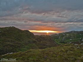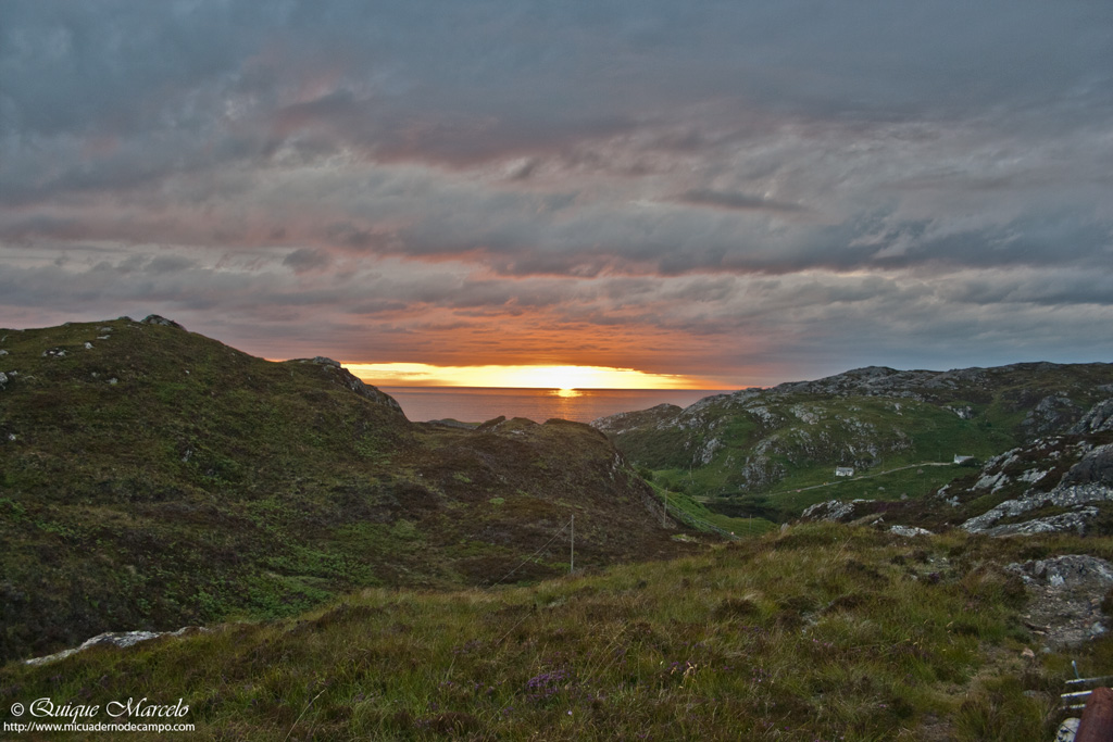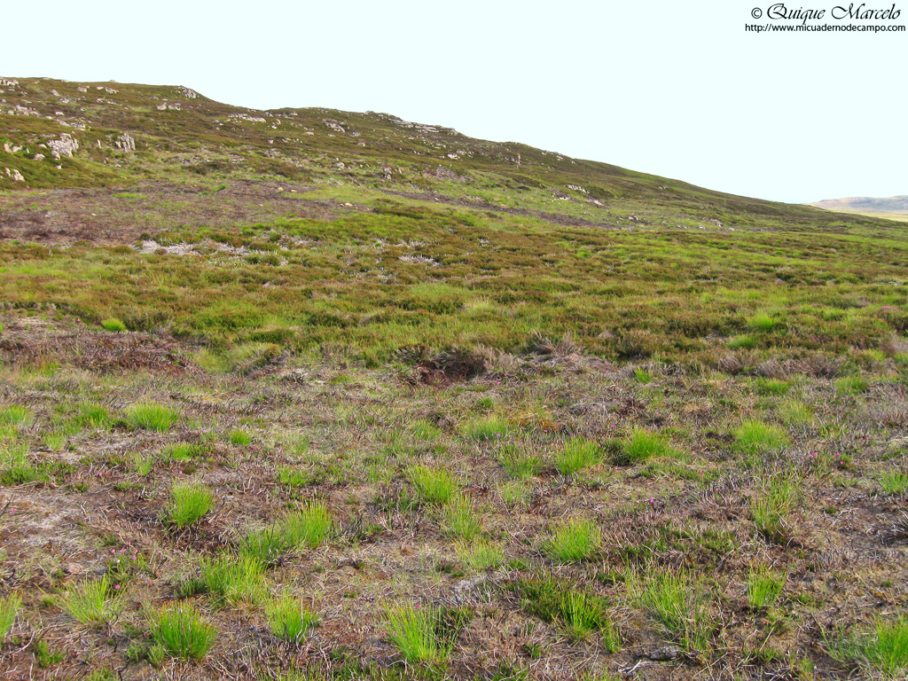 Dormimos en un apartadero que tiene la carretera a menos de un Kilometro del puerto de Tarbet y por la mañana temprano después de desayunar, cogimos el barco que nos llevó a la Isla de Handa. Handa es una isla con grandes páramos de brezo, en la cual, se puede ver Págalo grande (Stercorarius skua) y Págalo parásito (Stercorarius parasiticus) que hasta hace poco no criaban allí, pero de unos años a esta parte, aunque en pequeños números, también sacan adelante a sus pequeñajos, a base de capturar pollos y huevos de las grandes colonias de aves marinas que anidan en sus acantilados. Handa tiene un recorrido circular de unos 6 kilómetros que Iris aguantó como una campeona, aunque eso sí, al final quejándose un poco, pero es lo normal. Al desembarcar en la pequeña playa que tiene la isla, te llevan a una caseta en la que nos contaron qué especies podíamos ver y sobretodo el peligro que había ese día en la isla. Era un día totalmente despejado y hacía bastante calor, tanto que estuvimos en manga corta, algo impensable en esas latitudes, pero a causa de ese calor nos advirtieron que el tiempo puede cambiar de una manera muy rápida y una tormenta eléctrica podría ser peligrosa si nos encontrábamos en el punto más alto de la isla, y por tanto sí eso ocurría, deberíamos intentar llegar lo antes posible de nuevo a la caseta, pero no ocurrió, nos hizo un día esplendido en la preciosa isla de Handa, que sin duda es altamente recomendable para los amantes de los pájaros y de la fotografía. En ella pudimos ver, Alca común (Alca torda), Arao común (Uria aalge), Fulmar boreal (Fulmarus glacialis), Gaviota tridáctila (Rissa tridactyla) y algún Frailecillo atlántico (Fratercula arctica) en los cortados que tiene en el norte de la isla, luego por todas partes se veían Págalo grande (Stercorarius skua) y en menor número Págalo parásito (Stercorarius parasiticus), qué ambas especies anidan en los páramos centrales de la isla, y también llegamos a ver una familia de Lagópodo escocés (Lagopus lagopus scotica) alimentándose a pocos metros de nosotros, la cual, se dejó hacer unas cuantas fotos. Otros pájaros observados, Gavión atlántico (Larus marinus), Gaviota argéntea europea (Larus argentatus), Pardillo piquigüaldo (Carduelis flavirostris), Bisbita costero (Anthus petrosus), Bisbita pratense (Anthus pratensis), Alcatraz atlántico (Morus bassanus), etc. Regresamos a Tarbet sobre las 16:00 horas y en el mismo aparcamiento nos dimos una duchita y comimos para recuperarnos de la caminata mañanera. Más tarde intentamos llegar al cabo Wrath, que es el cabo que está justo en la punta Noroeste de la tierra principal, pero desestimamos la opción, ya que había que coger un ferry para llegar y se nos iba a ir lo que quedaba de día, por lo tanto nos dirigimos hacia el sur pasando por Lochinver, un pueblo costero muy cerca de la isla de Handa y llegamos finalmente a Loch Assynt, un gran lago en el que nos habían comentado que podía ser un buen sitio para ver Colimbo ártico (Gavia arctica), aunque el gran colimbo de la garganta negra no apareció, y percibía que a éste no iba a ser fácil encontrarle, aunque no perdía la esperanza. Dormimos en un camino entre Lochinver y el Loch Assynt. |