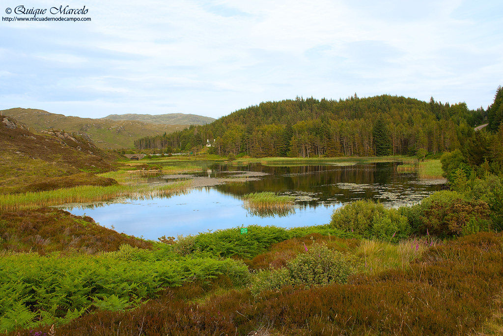 Me levanté sobre las 7:00 horas y a las 7:30 horas después de tomar un café, estaba con los prismáticos en mano, para hacer una de las rutas que salen desde el aparcamiento, concretamente, tomé el camino que lleva a un pequeño lago llamado Loch Coire. El camino es espectacular entre un viejo bosque de Pino silvestre (Pinus sylvestris), en el cual, logro ver Chochín (Troglodytes troglodytes), Mosquitero común (Phylloscopus collybita), Bisbita arbóreo (Anthus trivialis) con ceba, Carbonero garrapinos (Periparus ater britannicus), Busardo ratonero (Buteo buteo), etc., para. más tarde llegar a un alto, que desde él se puede ver el precioso lago rodeado de pinos por todos lados y en el que sobre su superficie flotan un montón de nenúfares, un lugar de fotografía. Nada más llegar oigo el reclamo de un Zampullín común (Tachybaptus ruficollis), al que luego más tarde descubro acompañado de su pareja y de dos pollos cabecirayados ya bastantes grandes, pero sobretodo el lugar es ideal para ver libélulas, así me lo hacen saber dos personas que llegan algo más tarde con la única intención de tomar fotos de esos espectaculares insectos, y la verdad, es que el lago está lleno de ellas. Después de un buen rato disfrutando del Loch y sus habitantes, vuelvo sobre mis pasos para llegar de nuevo a la autocaravana y ver si las chicas ya se han levantado, como así es. Una vez que desayunan, todos juntos hacemos el camino que lleva a Dog Falls, una ruta algo más corta que la que hice por la mañana y que te conduce a unas pequeñas cataratas en un lugar donde se estrecha bastante el rio, y en el cual, vemos una pareja de Lavandera cascadeña (Motacilla cinerea) alimentando a un solitario pollo ya bastante grande. Una vez de vuelta al aparcamiento, volvemos al Loch Affric a tomar unas fotos del precioso paisaje, ya que el día anterior no las hicimos por falta de luz y seguimos camino hasta nuestro siguiente destino. Nuestro objetivo es llegar a Tarbet, un pequeño pueblo desde donde salen los barcos hacia la isla de Handa. Tarbet se encuentra en el Noroeste de Escocia y fue el lugar más al norte que estuvimos. Llegamos por la tarde con bastante luz todavía, al menos, para observar a través del telescopio, y desde el mismo puerto vimos Arao aliblanco (Cepphus grylle), Gavión atlántico (Larus marinus), Págalo grande (Stercocarius skua), Gaviota cana (Larus canus), Gaviota argéntea europea (Larus argentatus), Pardillo piquigüaldo (Carduelis flavirostris) y Ánsar común (Anser anser), entre otros. Pegados al puerto, ducha, cena y a dormir. |