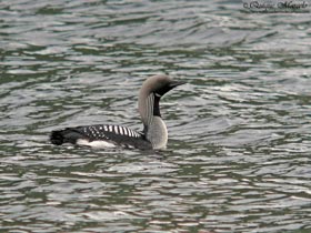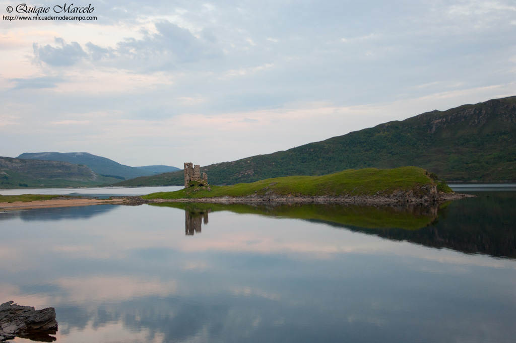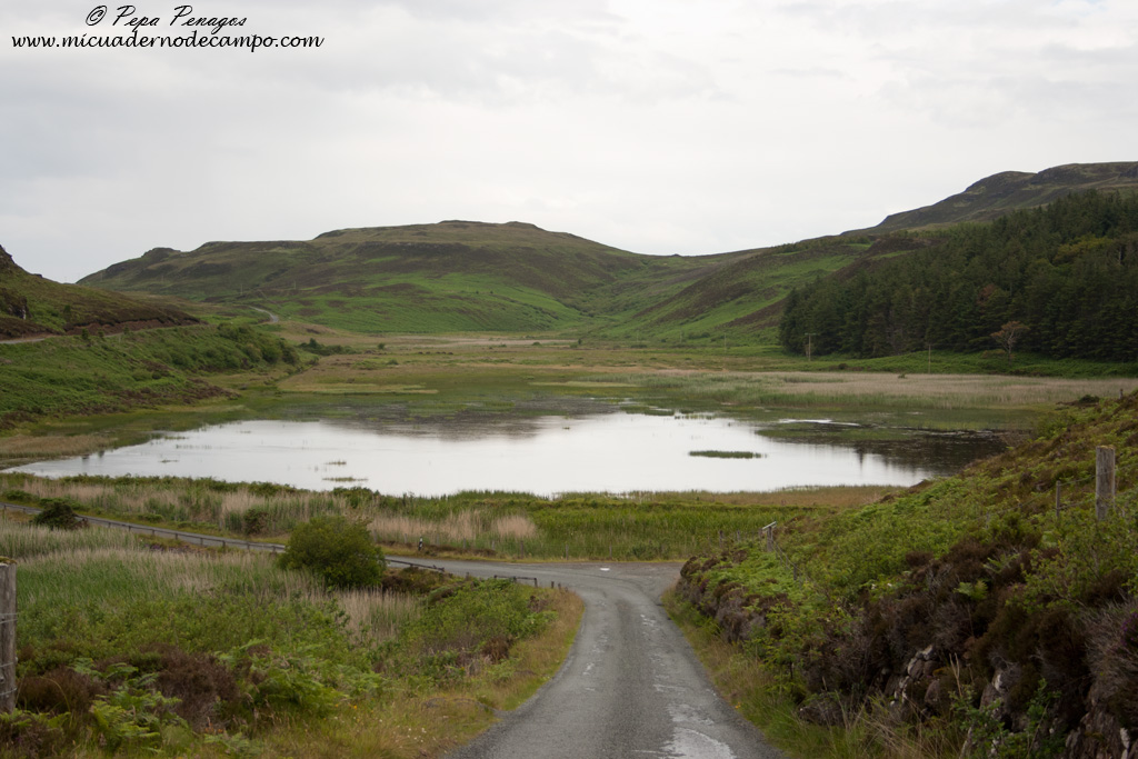 Nos levantamos tranquilamente porque todo el día lo íbamos a pasar por Inverpolly que tiene bastantes grandes lochs y el objetivo era ir mirando en todos ellos para ver si en alguno aparecía Serreta grande (Mergus merganser) o el deseado y escaso, Colimbo ártico (Gavia arctica). En primer lugar chequeamos de nuevo el gigante Loch Assynt, pero una vez más, un lago enorme, en el cual no hay ni un solo pájaro sobre su superficie, pero esto no nos pilló de improviso, ya que era tal y como nos había ocurrido en casi todos los grandes lagos que habíamos chequeado durante el viaje. Más tarde fuimos hacia Inverpolly, un área salpicada con bastantes lochs, pero tampoco tuvimos suerte, eso sí, vimos varias parejas de Gaviota cana (Larus canus) que disfrutamos muchísimo, aunque más tarde se volverían muy numerosas. El siguiente punto era Loch Maree, otro inmenso lago en el cual algunos carteles informativos indicaban que era uno de los mejores lugares del Reino Unido para ver Colimbo ártico (Gavia arctica), ya que todos los años criaban varias parejas allí sobre las pequeñas islitas que tenía el gran loch, pero más de lo mismo, ni un solo pájaro sobre su superficie. Decidimos dirigirnos hacia Kyle of Lochalsh, una población donde se encuentra el puente para cruzar a la isla de Skye, con la intención de, lago que viéramos, lago que pararíamos para chequearlo, e intentar de esa manera encontrar algún ejemplar del deseado colimbo. Ya casi con la esperanza perdida, al acercarnos a un loch que tenía un par de islitas en el medio, no tan grande como Assynt o Maree, dije, "en ese lago va a haber una parejita de “Black-throated Diver", en inglés, Colimbo ártico. Paramos en uno de los apartaderos de la carretera que quedaba alto respecto al lago, ubicado concretamente en una zona denominada Glen Carron, y en una primera inspección no vimos nada, pero algo más tarde vi algo negro y blanco nadando lejísimos, eso sí, podría ser un Colimbo chico que en otra ocasión que canté al ártico, luego cuando miré con el telescopio con detenimiento vi como me había equivocado, pero esta vez no había duda, estaba viendo a través de la lente de mi teles un precioso Colimbo ártico, con su espectacular plumaje nupcial. Ahí estaba delante de nuestros ojos el gran colimbo de garganta negra, pájaro precioso, estilizado y elegante, y mucho mejor, se iba acercando poco a poco, por lo tanto, bajamos hasta la misma orilla del lago con la autocaravana, por un pequeño camino que llevaba a una caseta medio abandonada. El Colimbo se llegó a acercar a poco menos de 50 metros de nosotros que aguardábamos escondidos detrás de la autocaravana. Estuvimos disfrutándole cerca de una hora, hasta que se fué alejando poco a poco. También llegamos a ver otro ejemplar, seguramente la pareja, bastante lejos de nuestra posición, como a unos 600-700 metros. Reemprendimos el camino y llegamos a Kyle of Lochalsh felices por el avistamiento, que sinceramente es uno de los que más ilusión me hizo del viaje , porque seguramente esos lagos por los que pasamos ese día, serían el último intento para encontrarle, como así fué, en los siguientes días, ni rastro de Colimbo ártico. En Kyle of Lochalsh paramos para hacer unas cuantas fotos al famoso castillo de Eilan Donan y cruzamos el puente sobre el mar para llegar a la isla de Skye donde dormimos en el primer pueblo que nos encontramos, Kyleakin. |