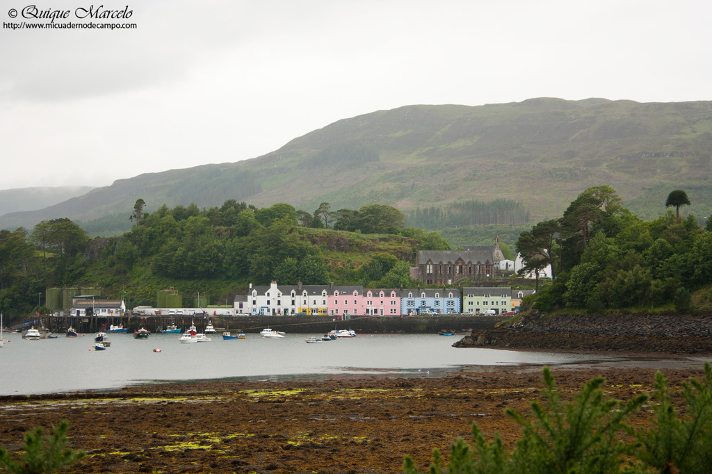 Al levantarnos en Kyleakin, observamos por la ventana de la autocaravana que llovía bastante, de una manera que hasta el momento no habíamos visto, porque a decir verdad, estábamos teniendo mucha suerte con el tiempo hasta ese momento, pero bueno, ese día tocó llover a cántaros y no paró hasta que nos acostamos. Con el día lloviendo y la luz pésima, no había mucha oportunidad para la fotografía, y en muchas ocasiones ni siquiera para la observación, con lo cual, dedicamos la mañana a visitar la ciudad de Portree, mirar en el puerto el lugar donde salían los barcos para ir a ver Pigargo europeo (Haliaeetus albicilla) alguno de los días que íbamos a pasar allí y a comer Fish and chips, pescado rebozado y frito con patatas que te venden en cucuruchos, muy típico en Escocia. Por la tarde nos recorrimos todo el norte de la isla en coche (llovía mucho) y terminamos el día durmiendo en Waternish Point, el cabo que está en la parte Noroeste de la isla. Aunque la luz fue pésima para la fotografía, pudimos ver bastantes pájaros, entre ellos, Eider común (Somateria mollissima), Busardo ratonero (Buteo buteo), Gaviota cana (Larus canus), Gaviota argéntea europea (Larus argentatus), Charrán ártico (Sterna paradisaea), Graja (Corvus frugilegus), Corneja cenicienta (Corvus cornix), Camachuelo común (Pyrrhula pyrrhula), etc., además de unas cuantos individuos de Foca gris (Halichoerus grypus) descansando en la orilla rocosa de una isleta cercana a la orilla. |