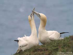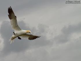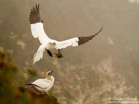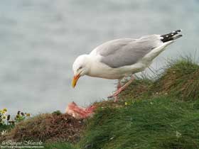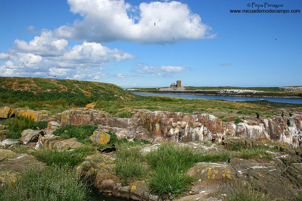 Sobre las 7:00 horas me levanté, desayuné, y salí hacia los cortados mientras que las chicas se quedaron durmiendo. Con la reserva todavía cerrada al público, pasé por una especie de cancela que estaba abierta y en pocos minutos llegué a unos acantilados gigantes de más de 200 metros de altura, con una gran colonia de cría de Alcatraz atlántico (Morus bassanus) que volaban a muy pocos metros por encima de mi cabeza, tanto, que muchas veces no me entraban en el encuadre de mi cámara de fotos, para volverse loco. Además de alcatraces, también allí anidaban, Arao común (Uria aalge), Alca común (Alca torda), Gaviota tridáctila (Larus argentatus), Paloma bravía (Columba livia), y en menor número Frailecillo atlántico (Fratercula arctica). También vi Escribano palustre (Emberiza schoeniclus), Alondra común (Alauda arvensis), Bisbita pratense (Anthus pratensis) y dicen que no es difícil ver Halcón peregrino (Falco peregrinus) buscando alguna presa por los cortados o la esquiva Comadreja (Mustela nivalis) mientras andas por los caminos, pero yo no tuve esa suerte. Volví sobre las 9:30 horas a la autocaravana y las chicas ya estaban casi terminando de desayunar, por lo tanto, una vez terminaron, nos encaminamos los tres a los acantilados, donde justo antes de llegar vemos una Gaviota argéntea europea (Larus argentatus) comiendo a muy pocos metros de nosotros un desafortunado pollo de Gaviota tridáctila (Rissa tridactyla). Volvimos a la hora de la comida con las tarjetas llenas de fotografías de álcidos, alcatraces, gaviotas, etc., sin lugar a dudas, habíamos aprovechado bien nuestra visita a Bempton, lugar que dicen es la mayor colonia de Alcatraz atlántico (Morus bassanus) situada en la tierra principal del Reino Unido. Una vez que comimos y descansamos algo, salimos por la tarde hacia una población, a unos 300 kilómetros al norte, llamada Seahouses, ya que al día siguiente pretendíamos coger un barquito por la mañana temprano que nos llevaría hasta las islas Farne. Llegamos casi con el día terminado, sólamente dió tiempo para ir al puerto y ver la hora de salida de los botes antes de buscar sitio para dormir. |