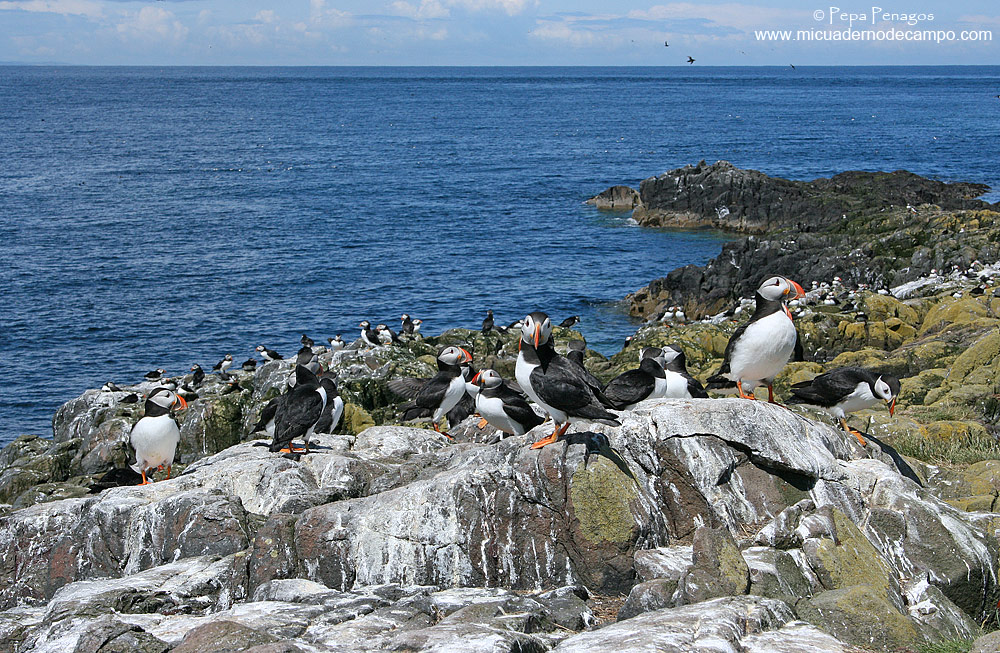 Dormimos junto a un campo de golf en el pueblo de Seahouses, y nada más levantarme, por la ventana de la autocaravana vi un Bisbita pratense (Anthus pratensis), varios individuos de Estornino pinto (Sturnus vulgaris), y la primera Lavandera blanca de la subespecie británica (Motacilla alba yarrelii) del viaje, todos ellos alimentándose en el cuidadísimo césped del campo de golf. Desayunamos rápido, pasamos por una gasolinera para llenar el depósito de gasoil, también para llenar el depósito del agua, para algo más tarde dirigirnos al puerto donde salía el barco a las 10:00 horas. Esperando que fueran las 10:00 horas para embarcar, pudimos observar en el pequeño puerto, Eider común (Somateria mollissima), Ostrero euroasiático (Haematopus ostralegus), Gaviota argéntea europea (Larus argentatus), Gaviota reidora (Chroicocephalus ridibundus), Vuelvepiedras (Arenaria interpres), Estornino pinto (Sturnus vulgaris), Gorrión común (Passer domesticus) , Paloma bravía (Columba livia), Charrancito (Sterna albifrons) lanzándose de cabeza al agua, Gaviota sombría (Larus fuscus), etc. El viaje que elegimos para visitar las Islas Farne nos llevó primeramente a una isla donde no desembarcamos y desde el mismo bote se podía fotografiar a las colonias de aves marinas que allí anidaban, después, nos llevaron a otra isla, la cual tenía una numerosa colonia de Foca gris (Halichoerus grypus), que pudimos fotografiar a muy pocos metros, pero lo mejor estaba por llegar. Desembarcamos en dos islas, la primera Inner y la segunda la que da nombre al conjunto de islotes, Farne. En la primera la concentración de Frailecillo atlántico (Fratercula arctica), Cormorán moñudo (Phalacrocorax aristotelis),Gaviota tridáctila (Rissa tridactyla),Arao común (Uria aalge) y Alca común (Alca torda) era tal, que te podías sentar a prácticamente un metro escaso de la hura de un Frailecillo o al lado de un Cormorán moñudo en el nido con su pollo sin que ellos ni se inmutaran, increíble. En la segunda isla había una gran colonia de Charrán común (Sterna hirundo) , Charrán ártico (Sterna paradisaea) y también alguna pareja de Charrán patinegro (Sterna sandvicensis) y Charrán rosado (Sterna dougalii), pero a éste último fue prácticamente imposible de encontrar entre miles de charranes. Ya nos habían avisado en el barco que nos cubriéramos la cabeza con algún gorro, porque los charranes nos picarían en ella sin ningún tipo de reparo, como así fue, Iris estaba totalmente alucinada, decenas de charranes volando a centímetros de su cabeza con sus pollos allí mismo en el suelo, espectacular. En esta segunda isla, andando un poco más hacia adelante llegamos a una zona donde las huras de los frailecillos estaban por miles, y el espectáculo era verlos llegar volando con el pico repleto de pequeños peces a sus nidos, y como nada más aterrizar varios individuos de Gaviota reidora (Chroicocephalus ridibundus) se abalanzaban sobre ellos para despojarles del trofeo que portaban en sus picos, y muchas veces tenían éxito. Después de casi cinco horas de pajareo extremo en las Islas Farne, todavía en territorio inglés, llegamos de nuevo al puerto de Seahouses, donde comimos más bien tarde, descansamos un rato y salimos con dirección a Loch of the Lowes, ya en las Highlands escocesas, a unos 280 kilómetros, donde llegamos cerca de las 22:00 horas. En Escocia, a todas las grandes balsas de agua ya sea salada o dulce, se les llama LOCH, que en gaélico significa Lago, sirva a modo de aclaración, ya que a lo largo del trip vaís a ver muy a menudo esta palabra. |