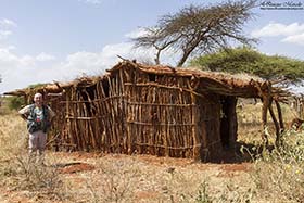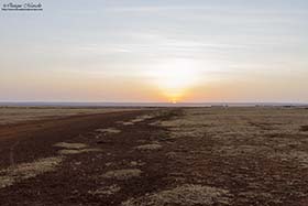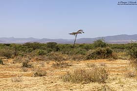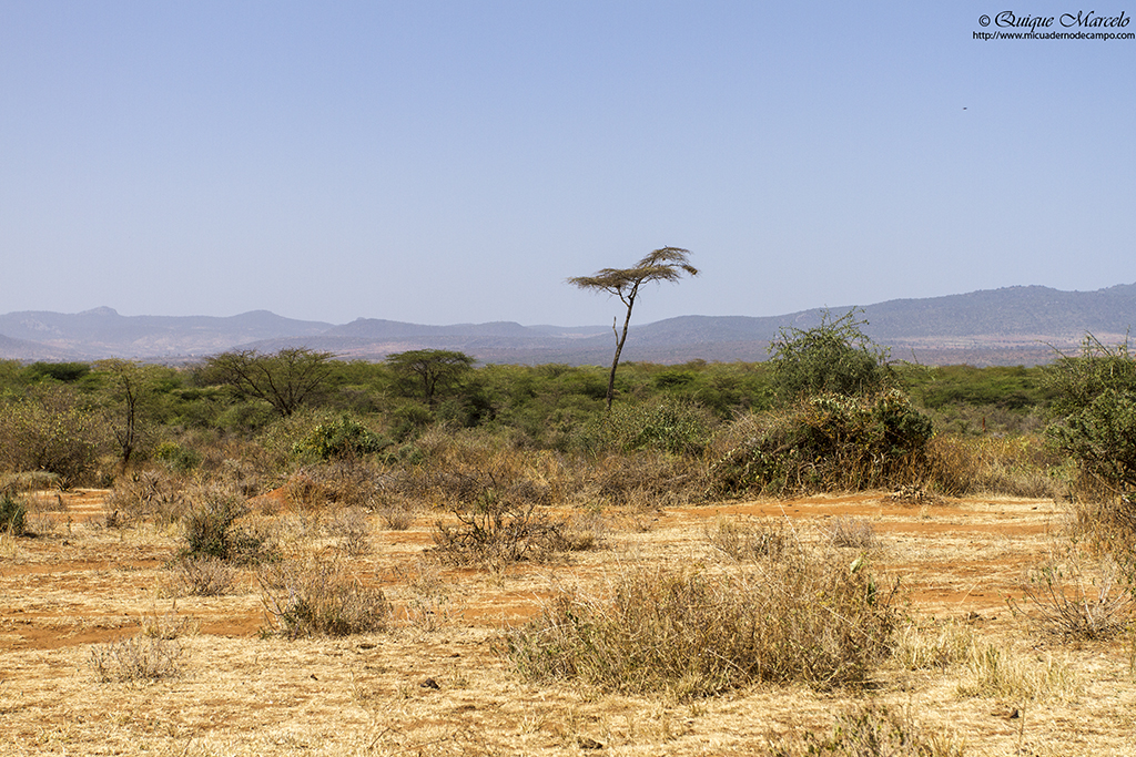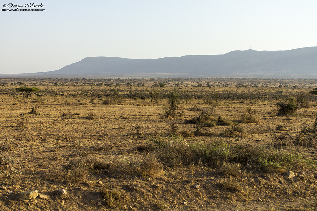 Hoy hemos salido de Negele muy pronto, sobre las 06:00, con dirección a los llanos de Liben en busca de la Alondra de Sidamo (Heteromirafra sidamoensis), un escasísimo endemismo que solamente se puede encontrar en aquel lugar. Elias nos dice que en aquellos extensos llanos, que para más "inri" en aquel momento tenían la hierba bastante alta, se encuentran muy pocos ejemplares de esta rara alondra, ya que les cuesta mucho criar por diferentes causas, razón por la cual está tan amenazada, y que verla, quizás la logremos ver, pero posiblemente sean muy fugaces las observaciones. Solamente cuando alce el vuelo y se cierna durante unos segundos en el aire, conducta habitual de muchos alaúdidos, con lo cual, seremos muy afortunados si tenemos la suerte de verla posada en el suelo, momento que sería mucho mejor para disfrutarla. Si ya nada más empezar la jornada, buscas un objetivo, y tu guía te cuenta esto, solamente piensas que ojalá la vea aunque solamente sea volando. Pero alguna vez el diablo va y se pone de tu parte, tal y como decía en una de sus canciones el magnífico Joaquín Sabina, y después de mucho buscar Elias y algún paisano más que hay por la zona, llegan a localizar un ejemplar que alza el vuelo y se queda cantando suspendida en el aire durante muy pocos segundos a poca altura, para después caer a plomo justamente en un terreno totalmente despejado de hierbas a escasos 10 metros de mi posición. La he podido ver muy bien, la he disfrutado durante unos 15 segundos, e incluso, la he podido fotografiar. Una gozada, vemos una Alondra de Sidamo (Heteromirafra sidamoensis) en un extensísimo llano con toda la gente muy dispersa buscándola, y la alondra ha elegido posarse a mi lado, quizás tenga un imán, jajajaja, magnífico momento. Otros pájaros que logramos ver allí fueron, Terrera somalí (Calandrella somalica), otro endemismo pero mucho más fácil de ver, Collalba Isabel (Oenanthe isabellina), Avefría coronada (Vanellus coronatus), Aguilucho papialbo (Circus macrourus), etc. Con el subidón que te proporciona un momento como el contado, emprendimos nuestro viaje hacia el sur, hacia Yabelo. Hicimos muchas paradas durante el camino, ya que Yabelo se encuentra a más de 300 km de los Llanos de Liben. En una de las paradas que hicimos nada más salir de los llanos, hemos podido observar un buen número de individuos de Estornino coroniblanco (Spreo albicapillus), Estornino soberbio (Lamprotornis superbus) y Bufalero piquirrojo (Bubalornis niger) comiendo en un campo cercano. Aquellos 300 y pico kilómetros han sido interminables por un polvoriento camino, en el cual, pocas veces te cruzabas con un coche, pero que cuando ocurría, teníamos que cerrar rápidamente nuestras ventanillas para evitar que se introdujera todo el polvo del mundo dentro del coche, cosa que muchas veces no podíamos evitar, ya que la ventanilla trasera izquierda no funcionaba bien. Fuimos cruzando un buen número de poblados, en los cuales, siempre tenías de sonido de fondo a los niños gritando "farengi, farengi, farengi....", palabra con la que intentaban llamar nuestra atención y que Elias nos dijo que quería decir algo así como, hombre blanco. El lugar donde hemos comido no se puede contar con palabras, una choza al más puro estilo africano, donde estaban tostando café en una especie de pequeña cacerola, y donde he dejado la bufanda de la U.D. Villar del Olmo. Mi amigo Santi me pidió que dejara la bufanda en un lugar único, y éste reunía todas las condiciones. El pueblo se llama Wachile y es uno de los pocos lugares del cuerno de África donde se puede encontrar a la endémica Tórtola de Reichenow (Streptopelia reichenowi). Ésta cría en las estructuras de las casas de aquel pueblo. Llegamos a ver varios ejemplares en su nido, uno de ellos con varios pollos. Otras paradas que hicimos hasta llegar a Yabelo nos han proporcionado ver pájaros muy curiosos y llamativos como un Suimanga keniata (Anthreptes orientalis), Batis oriental (Batis orientalis), Abubilla arbórea menor (Rhinopomastus minor), Sisón moñudo etíope (Lophotis gindiana) o la impresionante Pintada vulturina (Acryllium vulturinum), y algún mamífero como, Dic-dic de Salt (Madoqua saltiana), Papión oliva (Papio anubis) o una impresionante Hiena manchada (Crocuta crocuta) atropellada en mitad del camino. Para terminar el día, hicimos una parada a unos 60 kilómetros de Yabelo con las últimas luces del día en una espectacular sabana, donde la sorpresa fue que nada más bajarnos del coche, pudimos contemplar a otro de los más escasos endemismos etíopes, la Golondrina coliblanca (Hirundo megaensis), y volví a tener mucha suerte, ya que ésta se posó en una rama de una de las escasas acacias que tenía cerca de mí. Además de la golondrina, vimos varios ejemplares de Gerenuk (Litocranius walleri) y Gacela de Grant (Gazella granti). Llegamos a Yabelo bastante cansados sobre las 20:00 horas.
