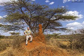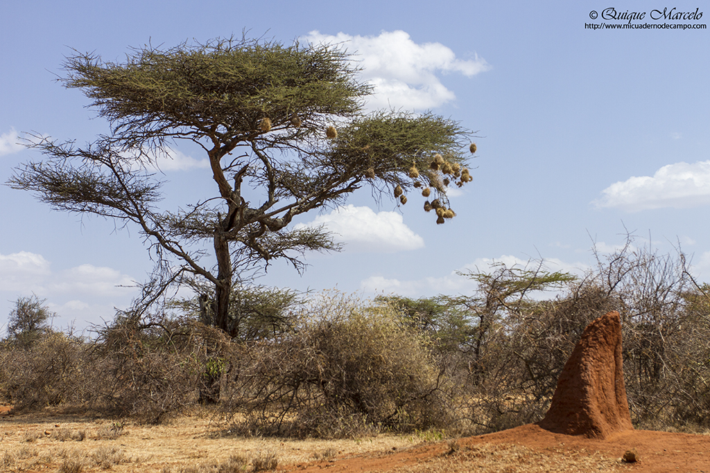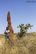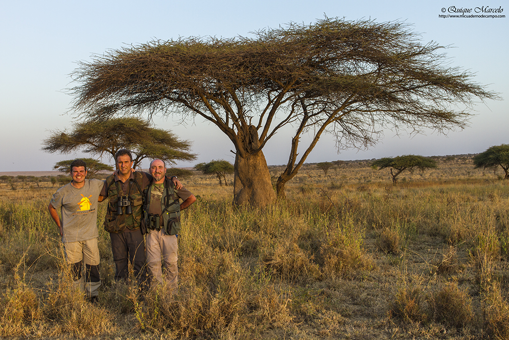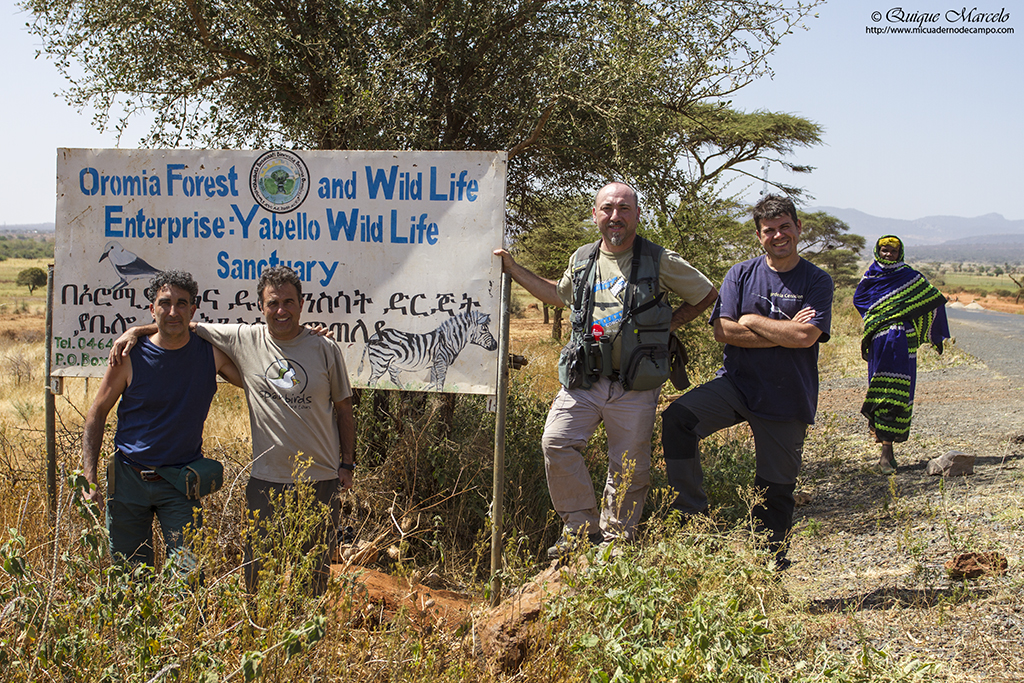 Toca diana a las 06:30 horas para desayunar e ir rápidamente al Parque Nacional Borana, pero nuevamente tardan muchísimo en servirnos, con lo cual, son las 07:30 horas cuando partimos. Una vez hemos llegado y Elias hace el chequeo pertinente en la puerta del parque, procedemos a entrar, y cuando todavía no habíamos circulado ni 100 metros, nos encontramos con otra de las estrellas del viaje, otro endemismo de esos que son bastante escasos, la Urraquita de Stresemann (Zavattariornis stresemanni), encaramada en lo alto de un termitero. Buen momento para empezar la mañana, aunque luego las volvimos a ver un buen número de ellas arreglando sus nidos en lo alto de una gigantesca acacia. El lugar es bastante seco y árido, pero como en todos los lugares de Etiopía, eso no es motivo para que no salgan pájaros a tu encuentro en cualquier sitio. Entre muchos de los que se nos cruzaron, puedo destacar Bubú pechirosado (Rhodophoneus cruentus), Estrilda culirroja (Estrilda rhodopyga), Estornino de Rüppell (Lamprotornis purpuroptera), Golondrina abisinia (Cecropsis abyssinica), Barbudo de Arnaud (Trachyphonus darnaudii), Eremomela de vientre amarillo (Eremomela icteropygialis), Tejedor social de Arnaud (Pseudonigrita arnaudi), etc., y entre los mamíferos, varios individuos de Ardilla terrestre lisa (Xerus rutilus) comiendo hormigas, aunque el momento mágico del día, fue una gran manada de Cebra de Grevy (Equus grevyi) que se pasearon bastante cerca de nosotros y que nos brindaron unos magníficos instantes revolcándose en un banco de arena que había en un camino, en ese momento pensé, "puff, esto es África en toda su salsa". Una vez salimos de la reserva, paramos en el pueblo de Yabelo, donde compramos pan y otras cosas para la comida y emprendimos viaje hacia un lugar llamado Simu, para buscar dos zorzales que no tardamos en encontrar, el Zorzal palmero moteado (Cichladusa guttata) y el Zorzal ceniciento (Turdus tephronotus), por cierto, sobretodo este último muy bonito, además también vimos Bulbul pardo (Phyllastrephus strepitans). La zona elegida para comer es un secarral, en el cual, aprieta el sol con justicia. Allí sacamos nuestra cuña de queso manchego y nuestro jamón y salchichón ibérico traído de Madrid, que para ser sinceros, nos supo a gloria. Lastima de una buena cervecita fresquita. Toda la tarde la gastamos en aquel lugar andando de aquí para allá buscando pájaros. Un lugareño habla con Elias y le comenta que nos puede llevar a ver Pintada vulturina (Acryllium vulturinum), a lo que sin dudarlo le decimos que sí. Pero luego nos dimos cuenta que fue una mala elección, hacía mucho calor, la caminata fue interminable por esa angosta sabana con árboles muy dispersos y cuando las encontramos en una zona más boscosa, se mostraron muy esquivas y tímidas, así que, solamente las pudimos disfrutar viéndolas en la lejanía. De vuelta hacía donde estaba el coche, donde se encontraban Fishea y Paco, por cierto, el amigo Paco llevaba un par de días que se sentía mal del estómago y no salía a andar, nos íbamos encontrando pájaros como Estornino soberbio (Lamprotornis superbus), Curruca de Böhm (Parisoma bohemi), Granadero oriental (Uraeginthus ianthinogaster), etc., y entre los mamíferos vimos un par de Dic-dic de Salt (Madoqua saltiana). Después de esa gran caminata, estaba como loco por llegar al coche, porque no nos habíamos llevado ni una mísera botella de agua y estaba sediento, pero allí no había tregua. Yo fui el último en llegar porque me había entretenido con un Eremomela de vientre amarillo (Eremomela icteropygialis) y cuando ya estaba alcanzando el coche, me estaban haciendo señas Angelito y Guille. Al acercarme, vi que tenían a 6 ó 7 metros un grupo de Urraquitas de Stresemann (Zavattariornis stresemanni) buscando comida. Estuvimos un buen rato fotografiándolas mientras escarbaban en el suelo con sus picos y la verdad, el momento fue memorable, lleno de fotos e incluso videos. Luego Elias nos avisó que había visto una Golondrina coliblanca (Hirundo megaensis) posada en un árbol, y aunque estaba muy a la sombra, le pude hacer alguna buena foto. Para terminar la tarde, recorrimos otra zona, siempre en los alrededores de Yabelo, donde encontramos un Serín picogordo norteño (Serinus donaldsoni), un pájaro muy interesante y bonito. De vuelta al hotel, encontramos otro grupo de Pintadas vulturinas (Acryllium vulturinum) y esta vez, si que las pudimos observar muy bien. Pasamos la noche en el Motel Yabelo, iba a ser nuestra segunda noche allí sin agua en las habitaciones, ya que, había un problema en el generador que abastece de luz y agua al pueblo. Pues nada, a ducharse tocaba con un cubo y un cazo. |