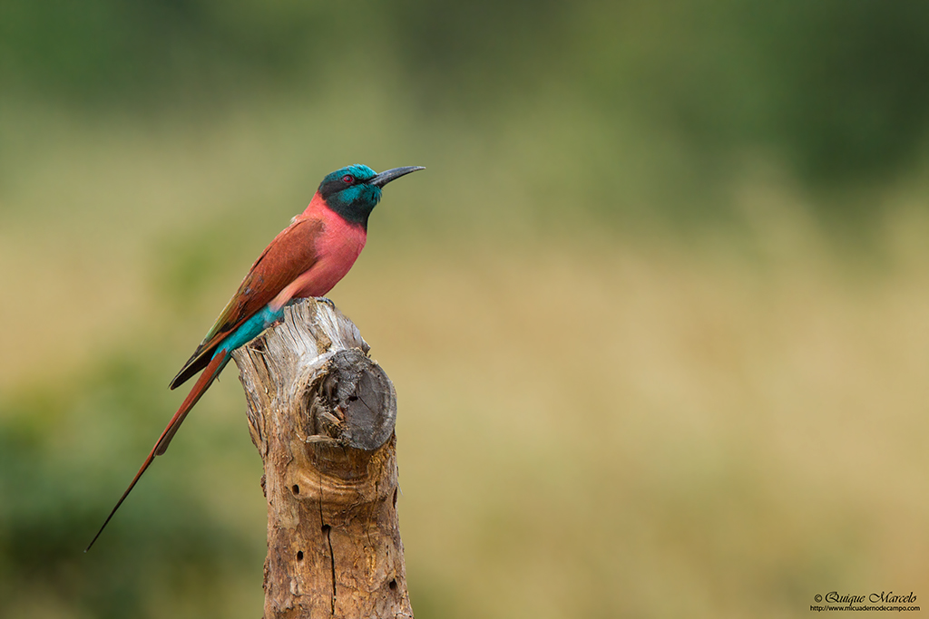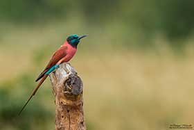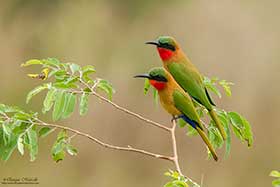 Toca el despertador como siempre a las 6:30 horas, desayuno a las 7:00 horas y antes de las 8:00 horas ya estamos en marcha. Al primer sitio que vamos a ir hoy es a la colonia de Abejaruco carmesí (Merops nubicus), Abejaruco gorgirrojo (Merops bullocki) y Abejaruco esmeralda (Merops orientalis) que hay cerca de una población llamada Wassu. Antes de llegar a Wassu, fuimos a unas construcciones megalíticas, llamadas Stone circles (Circulo de piedras), el cual, también tiene un museo donde te explican el origen de estas curiosas construcciones donde enterraban a sus muertos. En ese mismo lugar pudimos ver nuestros primeros Abejarucos carmesí (Merops nubicus), además de Loro senegalés (Poicephalus senegalus), Avefría coletuda (Vanellus tectus), etc., pero donde disfrutamos realmente del espectáculo de colores que es el Abejaruco carmín (Merops nubicus), es cuando estuvimos en la zona de alrededor del pueblo de Wassu donde se les suele ver. Los tuvimos realmente cerca, a tan solo 6-8 metros. Otros que vimos en aquella zona además de los ya nombrados, Abejaruco gorgirrojo (Merops bullocki) y Abejaruco esmeralda (Merops orientalis) fueron, Tórtola rabilarga (Oena capensis), Toco piquirrojo (Tockus erythrorhynchus), muy abundante durante todo el viaje, Águila de Wahlberg (Aquila wahlbergi), Viuda del paraiso (Vidua interjecta), Quelea común (Quelea quelea), Alcaudón de copete Yelcobé (Prionops plumatus), etc. Aprovechamos toda la mañana en la zona, antes de volver a comer al lodge Annex. Cuando volvíamos paramos para ver un Azor lagartijero oscuro (Melierax metabates) y una preciosa Culebrera sombría (Circaetus cinereus). Después de comer y descansar un rato en nuestras habitaciones, emprendimos el camino hacia la zona donde se encuentra Bird safari camp, lugar donde estaban alojados los chicos vascos. Antes de llegar, paramos en unos pequeños arrozales que están al lado del camino donde vemos claramente nuestro primer Mochuelo perlado (Glaucidium perlatum) y un Tordino cabecinegro (Turdoides reinwardtii) que enseguida da la voz de alarma y "sale de najas". Un poco más adelante en una zona más boscosa también disfrutamos de nuestra primera Gallinita roquera (Ptilopachus petrosus) escondida entre los arbustos pero que podemos ver relativamente bien. Cuando llegamos al campamento Bird safari camp nos encontramos con Juanma, Pacheco y compañía y nos enseñan un nido de Papamoscas palustre (Muscicapa aquatica). También vemos un Monarca paraíso africano (Terpsiphone viridis) e intentamos ver de nuevo por el campamento la Gallinita roquera (Ptilopachus petrosus), pero no hay suerte. Para terminar fuimos a una zona cercana donde es posible ver Ganga cuadricinta (Pterocles quadricinctus). En el lugar vemos una pareja de Gladiador cabecigrís (Malaconotus blanchoti) en lo alto de un Baobab (Adansonia digitata) y una Avefría coletuda (Vanellus tectus). Después de mucho buscar aparecen las gangas que podemos ver perfectamente con el telescopio pero casi sin luz para la fotografía. |