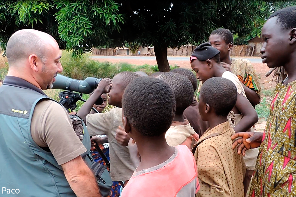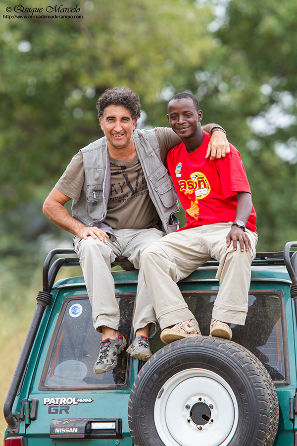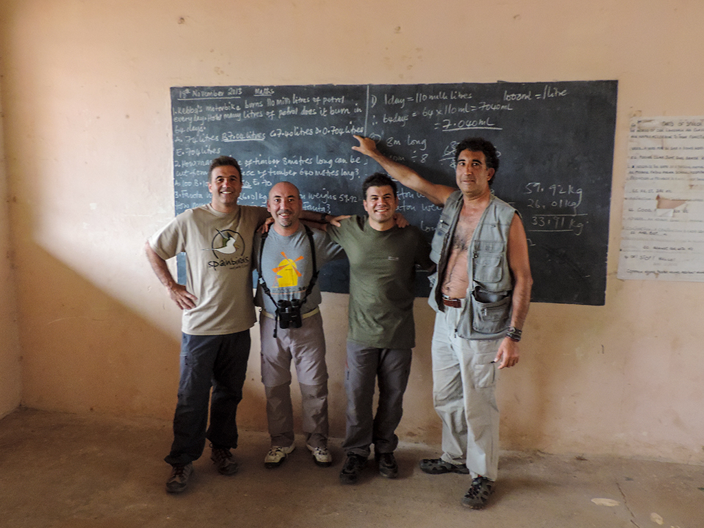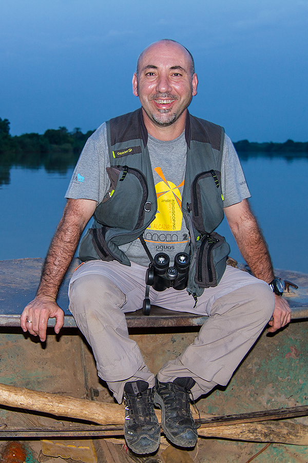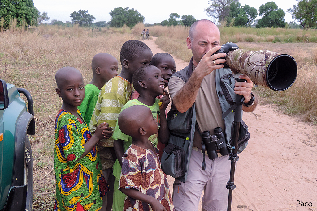 Sobre las 7:00 de la mañana empezaba a amanecer. Antes de desayunar salimos al exterior de nuestro alojamiento, ya que, el día anterior habíamos visto enfrente un colegio y pensamos que sería un buen lugar para entregar gran parte del material escolar que habíamos traído, así como, una equipación entera de futbol, camisetas, calzones, medias, balones, etc., que guardaba en casa de un antiguo equipo que había formado en Madrid y que en el momento de partir a Gambia pensé que era un buen lugar para dejarla, dado que hacía varios años que no la utilizaba. Había dos personas adultas en el centro del polvoriento patio del colegio, que luego resultaron ser el director del centro y el conserje. Nos acercamos a ellos y les preguntamos si podíamos hacer unas fotos a las clases de los chicos y al exterior del colegio, el director nos dijo, "¿De qué misión sois?, jaja, yo contesté, que no éramos de ninguna misión, pero sí que teníamos algo de material escolar y deportivo, que quizá le pudieran dar uso los chavales y chavalas del cole. Esa respuesta les gustó y acto seguido entramos en el destartalado despacho del director y les entregamos el material. Hicimos unas cuantas fotos de las clases, del colegio, mientras ya estaban llegando los primeros alumnos que se iban formando en el patio. Junkung y Cherino, ya nos estaban esperando en la puerta del lodge Annex para desayunar e irnos, mientras nosotros tomábamos fotos de los chavales cuando llegaban al cole y de las filas que formaban, mientras el director y profesores les daban una charla y ellos asentaban con su cabeza. Eran pasadas las 8:00 horas cuando nos íbamos ya, entonces el conserje vino hacia nosotros y nos dijo que nos acercáramos. Sacaron todo el material que les habíamos entregado y se lo mostró a los chavales en nuestra presencia, camiseta a camiseta, calzón a calzón, media a media. Fue un momento de éxtasis total de los chicos y chicas, teniendo problemas los profesores para mantener formados a los más de 200 que allí había. Como era lógico, les tuve que hablar un poco a los chavales y comentarles que aunque habíamos venido a ver pájaros a Gambia, también habíamos disfrutado mucho viendo su cole y entregándoles ese material. La buena acción del día estaba hecha y fue un momento inolvidable, muy bonito y reconfortante. Bueno, para empezar el día no estaba mal, ahora tocaba ir a por los pájaros Nada más salir, nos encontramos al grupo de Juanma, Pacheco, José Mari, etc., que estaban parados a un lado de la carretera viendo una pareja de Águilas de Wahlberg (Aquila walhbergi), una de morfo oscuro y la otra de morfo claro, bastante rara en esta especie, con lo cual empezaba bien el día, en cuanto a pajareo se refiere. Seguimos y llegamos a la colonia de los Abejarucos gorgirrojos (Merops bullocki) en Bansang Quarry, una pasada de pájaro. El sitio era unos pequeños cortados con una laguna a los pies, fruto de unas antiguas graveras de extracción de áridos. Había por los alrededores bastantes ejemplares de Tejedor casero (Ploceus cucullatus), Viuda senegalesa (Vidua chalybeata), etc., además de un Martín pescador pigmeo (Ceyx picta) que nos cruzó a toda pastilla. Al mirar a la charca descubrimos una preciosa pareja de Agüatero bengalí (Rostratula benghalensis), otra de las estrellas del viaje, aunque estaban lejos y pronto se escondieron. Decidimos ir encima del pequeño cortado para tener una vista más cercana del árbol donde los abejarucos se posaban, estaríamos a unos 15 metros de ellos, además, también tendríamos la posibilidad de ver a los agüateros donde se habían ocultado dada la posición del sitio. Cuando llegamos, el árbol estaba realmente cerca y pudimos fotografiar a los abejarucos a placer, pero los agüateros no aparecían, aunque entre foto y foto pudimos ver un Gavilán chikra (Accipiter badius) volando lejos. Al fin, los agüateros hicieron acto de presencia y realmente fue uno de los platos fuertes de la jornada, ya que los pudimos observar y fotografiar a muy buena distancia hasta que una Avefría espolada (Vanellus spinosus) llegó y se formó allí una trifulca que hizo que la parejita de agüateros volviera a desaparecer entre la espadaña. Con los deberes hechos nos fuimos al bosque de Kunkilling donde bimbamos otra espectacular especie, el Alcaraván del Cabo (Burhinus capensis), un pájaro muy esquivo y tímido pero que pudimos ver hasta unos 15 ejemplares, además, hicimos otros bimbos, como Barbudito frentigüaldo (Pogoniulus chrysoconus), Anteojitos senegalés (Zosterops senegalensis), Eremomela dorsiverde (Eremomela pusilla), Camaroptera baladora (Camaroptera brachyura), Barbudo sangrante (Lybius vieilloti), así como, un Marabú africano (Leptoptilos crumeniferus) volando a gran altura. Sobre las 13:00 horas llegamos al lodge Annex, donde comimos y descansamos un rato para pasar las duras horas centrales del día. Al cabo de una hora y media llegamos a la zona de los Hipopótamos (Hippopotamus amphibius) y después de buscarlos durante 10 minutos, encontramos un grupo familiar cerca de la orilla. Esto ya no era verlos en un documental de la televisión, si no que era verlos en su medio, alucinante, y más cuando los tuvimos a tan solo unos 25 metros, donde un enorme macho no dejaba de mirarnos fijamente y de vez en cuando desaparecía lentamente bajo el agua, momento que nos mirábamos entre nosotros y nos preguntábamos, "No vendrá por debajo, ¿Verdad?". De vuelta a Janjanbureh nos cruzó volando un grupo de Patos crestudos (Sarkidiornis melanotos). Más tarde vimos una escurridiza Prinia oropéndola (Hypercerus atriceps) entre el manglar, así como, Garcita verdosa (Butorides striatus), Cosifa coroniblanca (Cossypha albicapilla), y tres de los primates de Gambia, Colobo rojo (Piliocolobus badius), Mono verde (Cercopithecus aethiops) y Babuino de Guinea (Papio cynocephalus papio). Terminamos la jornada fotografiando un espectacular atardecer 