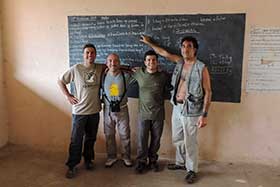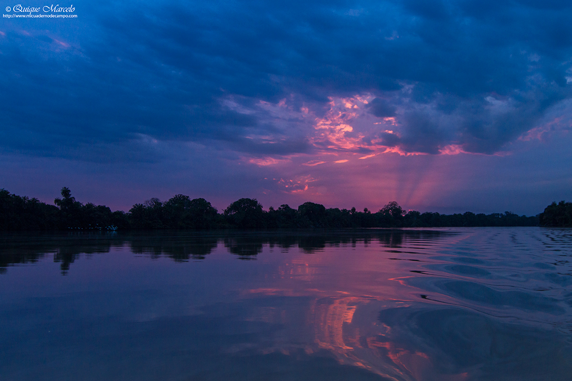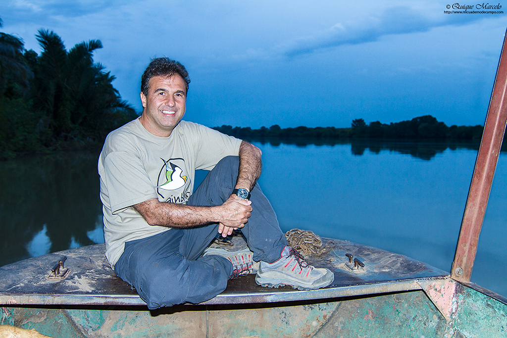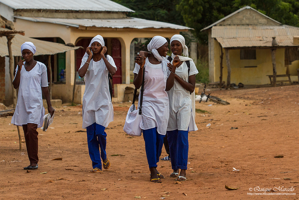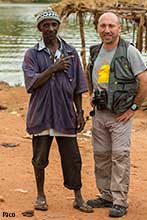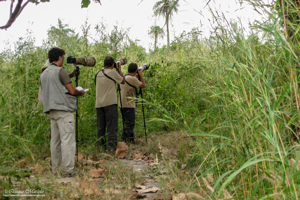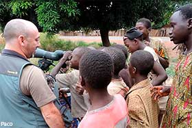 Sobre las 7:00 de la mañana empezaba a amanecer. Antes de desayunar salimos al exterior de nuestro alojamiento, ya que, el día anterior habíamos visto enfrente un colegio y pensamos que sería un buen lugar para entregar gran parte del material escolar que habíamos traído, así como, una equipación entera de futbol, camisetas, calzones, medias, balones, etc., que guardaba en casa de un antiguo equipo que había formado en Madrid y que en el momento de partir a Gambia pensé que era un buen lugar para dejarla, dado que hacía varios años que no la utilizaba. Había dos personas adultas en el centro del polvoriento patio del colegio, que luego resultaron ser el director del centro y el conserje. Nos acercamos a ellos y les preguntamos si podíamos hacer unas fotos a las clases de los chicos y al exterior del colegio, el director nos dijo, "¿De qué misión sois?, jaja, yo contesté, que no éramos de ninguna misión, pero sí que teníamos algo de material escolar y deportivo, que quizá le pudieran dar uso los chavales y chavalas del cole. Esa respuesta les gustó y acto seguido entramos en el destartalado despacho del director y les entregamos el material. Hicimos unas cuantas fotos de las clases, del colegio, mientras ya estaban llegando los primeros alumnos que se iban formando en el patio. Junkung y Cherino, ya nos estaban esperando en la puerta del lodge Annex para desayunar e irnos, mientras nosotros tomábamos fotos de los chavales cuando llegaban al cole y de las filas que formaban, mientras el director y profesores les daban una charla y ellos asentaban con su cabeza. Eran pasadas las 8:00 horas cuando nos íbamos ya, entonces el conserje vino hacia nosotros y nos dijo que nos acercáramos. Sacaron todo el material que les habíamos entregado y se lo mostró a los chavales en nuestra presencia, camiseta a camiseta, calzón a calzón, media a media. Fue un momento de éxtasis total de los chicos y chicas, teniendo problemas los profesores para mantener formados a los más de 200 que allí había. Como era lógico, les tuve que hablar un poco a los chavales y comentarles que aunque habíamos venido a ver pájaros a Gambia, también habíamos disfrutado mucho viendo su cole y entregándoles ese material. La buena acción del día estaba hecha y fue un momento inolvidable, muy bonito y reconfortante. Bueno, para empezar el día no estaba mal, ahora tocaba ir a por los pájaros Nada más salir, nos encontramos al grupo de Juanma, Pacheco, José Mari, etc., que estaban parados a un lado de la carretera viendo una pareja de Águilas de Wahlberg (Aquila walhbergi), una de morfo oscuro y la otra de morfo claro, bastante rara en esta especie, con lo cual empezaba bien el día, en cuanto a pajareo se refiere. Seguimos y llegamos a la colonia de los Abejarucos gorgirrojos (Merops bullocki) en Bansang Quarry, una pasada de pájaro. El sitio era unos pequeños cortados con una laguna a los pies, fruto de unas antiguas graveras de extracción de áridos. Había por los alrededores bastantes ejemplares de Tejedor casero (Ploceus cucullatus), Viuda senegalesa (Vidua chalybeata), etc., además de un Martín pescador pigmeo (Ceyx picta) que nos cruzó a toda pastilla. Al mirar a la charca descubrimos una preciosa pareja de Agüatero bengalí (Rostratula benghalensis), otra de las estrellas del viaje, aunque estaban lejos y pronto se escondieron. Decidimos ir encima del pequeño cortado para tener una vista más cercana del árbol donde los abejarucos se posaban, estaríamos a unos 15 metros de ellos, además, también tendríamos la posibilidad de ver a los agüateros donde se habían ocultado dada la posición del sitio. Cuando llegamos, el árbol estaba realmente cerca y pudimos fotografiar a los abejarucos a placer, pero los agüateros no aparecían, aunque entre foto y foto pudimos ver un Gavilán chikra (Accipiter badius) volando lejos. Al fin, los agüateros hicieron acto de presencia y realmente fue uno de los platos fuertes de la jornada, ya que los pudimos observar y fotografiar a muy buena distancia hasta que una Avefría espolada (Vanellus spinosus) llegó y se formó allí una trifulca que hizo que la parejita de agüateros volviera a desaparecer entre la espadaña. Con los deberes hechos nos fuimos al bosque de Kunkilling donde bimbamos otra espectacular especie, el Alcaraván del Cabo (Burhinus capensis), un pájaro muy esquivo y tímido pero que pudimos ver hasta unos 15 ejemplares, además, hicimos otros bimbos, como Barbudito frentigüaldo (Pogoniulus chrysoconus), Anteojitos senegalés (Zosterops senegalensis), Eremomela dorsiverde (Eremomela pusilla), Camaroptera baladora (Camaroptera brachyura), Barbudo sangrante (Lybius vieilloti), así como, un Marabú africano (Leptoptilos crumeniferus) volando a gran altura. Sobre las 13:00 horas llegamos al lodge Annex, donde comimos y descansamos un rato para pasar las duras horas centrales del día. Al cabo de una hora y media llegamos a la zona de los Hipopótamos (Hippopotamus amphibius) y después de buscarlos durante 10 minutos, encontramos un grupo familiar cerca de la orilla. Esto ya no era verlos en un documental de la televisión, si no que era verlos en su medio, alucinante, y más cuando los tuvimos a tan solo unos 25 metros, donde un enorme macho no dejaba de mirarnos fijamente y de vez en cuando desaparecía lentamente bajo el agua, momento que nos mirábamos entre nosotros y nos preguntábamos, "No vendrá por debajo, ¿Verdad?". De vuelta a Janjanbureh nos cruzó volando un grupo de Patos crestudos (Sarkidiornis melanotos). Más tarde vimos una escurridiza Prinia oropéndola (Hypercerus atriceps) entre el manglar, así como, Garcita verdosa (Butorides striatus), Cosifa coroniblanca (Cossypha albicapilla), y tres de los primates de Gambia, Colobo rojo (Piliocolobus badius), Mono verde (Cercopithecus aethiops) y Babuino de Guinea (Papio cynocephalus papio). Terminamos la jornada fotografiando un espectacular atardecer 