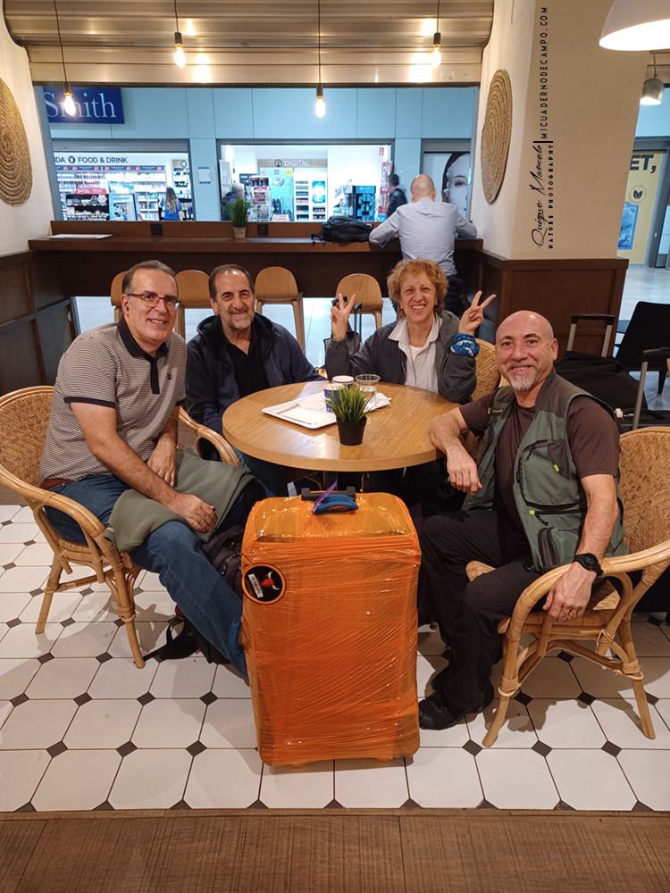 El primer día de nuestro viaje comienza temprano. Salgo de casa rumbo al aeropuerto de Madrid-Barajas, donde llego alrededor de las 7:45. Allí me encuentro con Juanma, el primero de mis tres compañeros. Poco después, a las 8:15, aparecen Manolo y Coral, y aprovechamos el momento para tomar un café juntos, repasar algunos detalles del viaje y compartir nuestras expectativas para la aventura que estamos a punto de comenzar. Tras la breve charla, nos dirigimos al mostrador de facturación y luego a las puertas de embarque. Nuestro viaje a Ghana está en marcha. Dado que no hay vuelos directos desde España a Ghana, hacemos nuestra primera y única escala en Roma, tras unas dos horas y media de vuelo. Desde la ventanilla del avión, ya en el aeropuerto de Fiumicino a nuestra llegada, observamos varios ejemplares de Corneja cenicienta (Corvus cornix) y de Gaviota patiamarilla (Larus michahellis), una sorpresa agradable antes de seguir rumbo al corazón de África. Nos trasladamos a la nueva puerta de embarque y, tras una espera de aproximadamente hora y media, abordamos el avión hacia Accra. El vuelo, de unas seis horas, transcurre sin novedad, y la mayor parte del tiempo lo pasamos dormitando para recuperar energías. Finalmente, aterrizamos en Accra alrededor de las 19:15 (hora local), dos horas más que en España, y ya encontramos la ciudad envuelta en la noche. A la salida del aeropuerto nos recibe Kalu, nuestro guía, quien nos acompaña hasta nuestro primer alojamiento en suelo ghanés: el His Presence Hotel. El 22 de octubre comenzó con una visita a la laguna Sakumono, un humedal estacional que, al final de la temporada de lluvias, mantiene aún varias áreas encharcadas, atrayendo una gran cantidad de aves, muchas de ellas migratorias desde el Paleártico Occidental, que aquí encuentran refugio para pasar el invierno. En este entorno, logramos avistar algunas especies destacadas: Barbudo bidentado (Pogonornis bidentatus), Bubú coronigualdo (Laniarius barbarus), Estornino colilargo (Lamprotornis caudatus), Suimanga cobrizo (Cinnyris cupreus), Bulbul gorjiamarillo (Atimastillas flavicollis), y Zarzalero charlatán (Bradypterus baboecala), entre otros. A mediodía, concluimos nuestra visita a Sakumono y partimos en nuestra Van, una Toyota Hiace, pilotada de manera impecable por nuestro conductor, Frank. Hicimos una breve parada para almorzar en un restaurante de carretera, antes de llegar a nuestro siguiente destino, Winneba Plains, una planicie que se extiende entre Accra y Cape Coast. Aunque el tiempo fue breve, logramos observar algunas especies notables, como Obispo dorsiamarillo (Euplectes macroura), Barbudo sangrante (Lybius vieilloti) y el Capuchino bronceado (Spermestes cucullata) entre otros. Luego, continuamos nuestro trayecto por unas dos horas, atravesando pueblos repletos de vida, hasta llegar al área de Kakum. Nos registramos en el Hans Cottage Lodge, que sería nuestro alojamiento en esta región. Aprovechando las últimas horas de luz, exploramos la entrada del Parque Nacional Kakum, donde rápidamente comenzamos a notar el reto que presentan estas selvas densas: los árboles gigantescos y la espesura dificultan considerablemente la localización de las aves, brindándonos solo destellos de su presencia y poniéndonos a prueba para identificarlas. Esto es lo que nos espera para el resto del viaje. Sin tiempo para más, volvemos al lodge, cena, ducha y a la cama. |