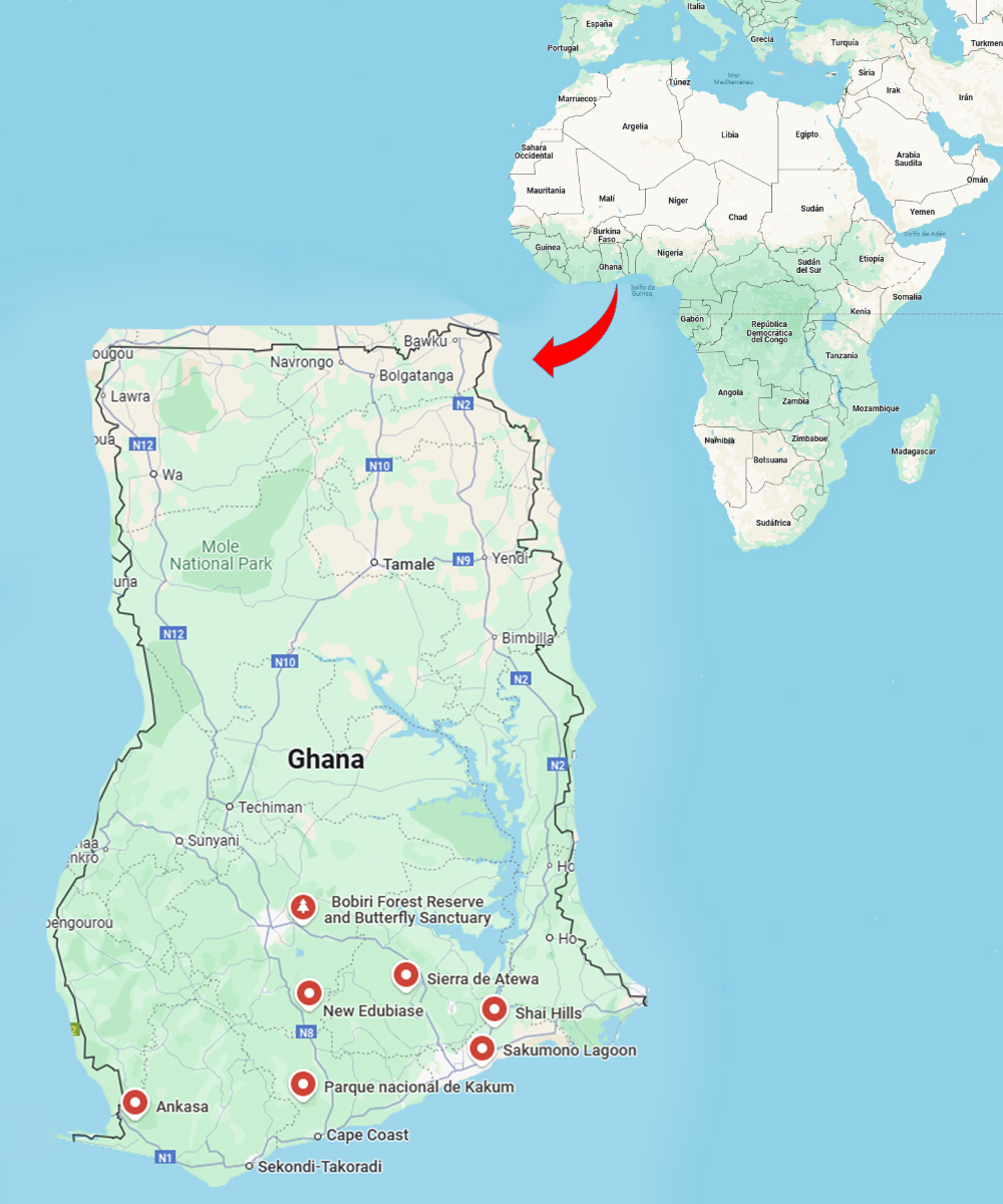 La República de Ghana, situada en la costa occidental de África, se despliega en el Golfo de Guinea y se distingue por su riqueza natural y diversidad climática, que divide el país en cuatro zonas principales. Al oeste y en el centro-norte del país, domina la típica sabana africana, árida y extensa, hogar de una fauna adaptada a las condiciones secas. Al este, por otro lado, se encuentran selvas semiecuatoriales, compuestas en su mayoría por bosques secundarios. En el suroeste, la vegetación se hace aún más densa, con selvas ecuatoriales de bosques primarios que destacan por su biodiversidad. Finalmente, el sur de Ghana se extiende hacia la costa atlántica, donde los paisajes lacustres y las playas completan un variado mosaico de ecosistemas. Durante nuestra visita, nos enfocamos en explorar la zona sur del país, donde, el primer y último día, recorrimos áreas de lagunas y sus planicies adyacentes en lugares como Sakumono lagoon, Winneba plains y Shai hills. Estos entornos lacustres nos brindaron las primeras oportunidades de observar aves y fauna en un ambiente más abierto con mayor oportunidad de fotografía. Sin embargo, la mayor parte de nuestra estancia transcurrió en el corazón de las selvas ecuatoriales, donde el desafío de detectar y fotografiar la vida salvaje fue considerablemente mayor, aunque gratificante. Estas densas selvas albergan algunas de las especies de aves más singulares y elusivas, haciendo de cada encuentro una experiencia especial y memorable por su dificultad en la detección y observación de ellas. |