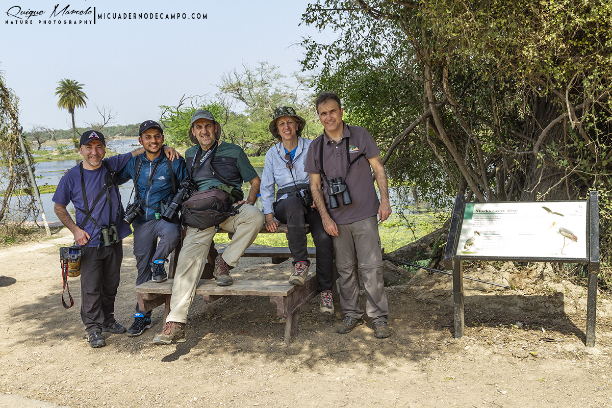 Salimos de Madrid el día 10 de marzo a las 5:50 y llegamos a Nueva Delhi sobre las 03:00 del día 11, después de una escala en Roma de 6 horas. Eran las 4 de la mañana aproximadamente cuando salimos del aeropuerto Indira Ghandi en la capital india y allí nos estaba esperando Sanjib Acharya, el guía que nos iba a acompañar en la totalidad del viaje. Coral y Manolo ya conocían a Sanjib porque le habían tenido de guía en un anterior viaje a Nepal, de hecho, ellos fueron los que propusieron en este viaje contratar los servicios de la empresa en la que estaba Sanjib trabajando como guía en la actualidad. Hablaban maravillas de él y la verdad es que no exageraron para nada, Sanjib no solamente es buenísimo como guía ornitológico, si no que, también es una persona muy humilde y amable que te hace muy cómodo y agradable el viaje. Sanjib es nepalí y había venido a trabajar a India a una de las empresas con más solera de todo el país, en cuanto a viajes de aventura y de naturaleza, Indian Adventures. Mientras nos presentábamos y saludábamos en el aeropuerto, llegó el minibús que nos iba a transportar la primera parte del viaje. El minibús tenía unas 20 plazas y era para nosotros nada más, todo un lujo de comodidad. Esta primera parte del viaje nos iba a llevar el primer día hacia Baratpur, a unas 6 horas de camino desde el aeropuerto, donde ya pudimos ver en el trayecto los primeros "bimbos" del viaje para algunos de nosotros, como Drongo real (Dicrurus macrocercus), Alción de Esmirna (Halcyon simirnensis), Tántalo indio (Mycteria leucocephala), Ibis oriental (Threskiornis melanocephalus), por nombrar algunos.