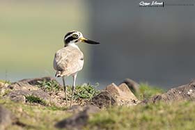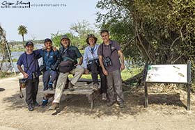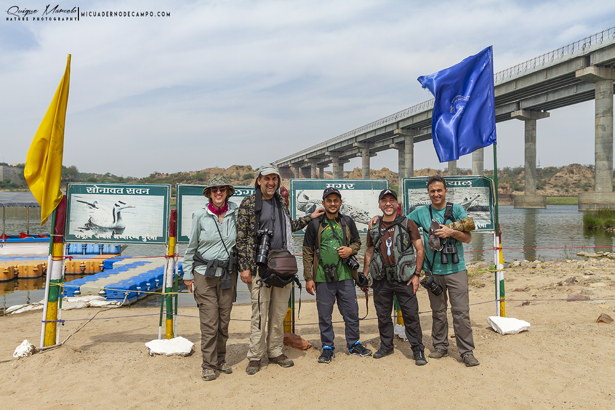 Después de un anterior día prácticamente sin parar, en el Parque Nacional Keoladeo Ghana, hoy parecía que iba a ser algo más tranquilo en cuanto a pájaros, pero finalmente, tuvimos una mañana también muy ajetreada en el río Chambal. La tarde sería mucho más tranquila visitando el Taj Mahal en Agra. Volviendo a la mañana; empezamos muy pronto, sobre las 6:30 nos levantamos y a las 6:45 estábamos desayunando. Una vez terminamos, viajamos en coche unas 2 horas hasta llegar al río Chambal. Al llegar allí, nada más bajarnos del coche vimos un Colinegro indio (Oenanthe fusca), una Tarabilla terrestre de la subespecie cambaiensis (Saxicoloides fulicatus cambaiensis) y un Mochuelo brahmán (Athene brama). Seguidamente, andamos el largo puente que cruzaba el río hasta llegar a la otra orilla, donde nos esperaban para embarcar y comenzar el tour por el río Chambal, del que dicen que, es el más limpio del país, y debe serlo, por la fauna que alberga dentro y alrededor de sus aguas, pero, sobre todo, porque de allí se extrae un buen porcentaje del agua que abastece el país. Mientras tanto, Manolo ya había divisado un alcaraván que le parecía raro en una pequeña isla en medio del río. En el bote viajábamos, además del barquero y otras dos personas de la tripulación, nosotros cuatro, Sanjib y un amigo suyo, que era compañero de trabajo en Asian adventures, Shyam Sharma, que, por cierto, él vive pegado a Keoladeo Ghana y el día anterior nos había acompañado también en nuestra visita al parque.