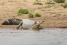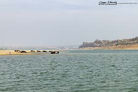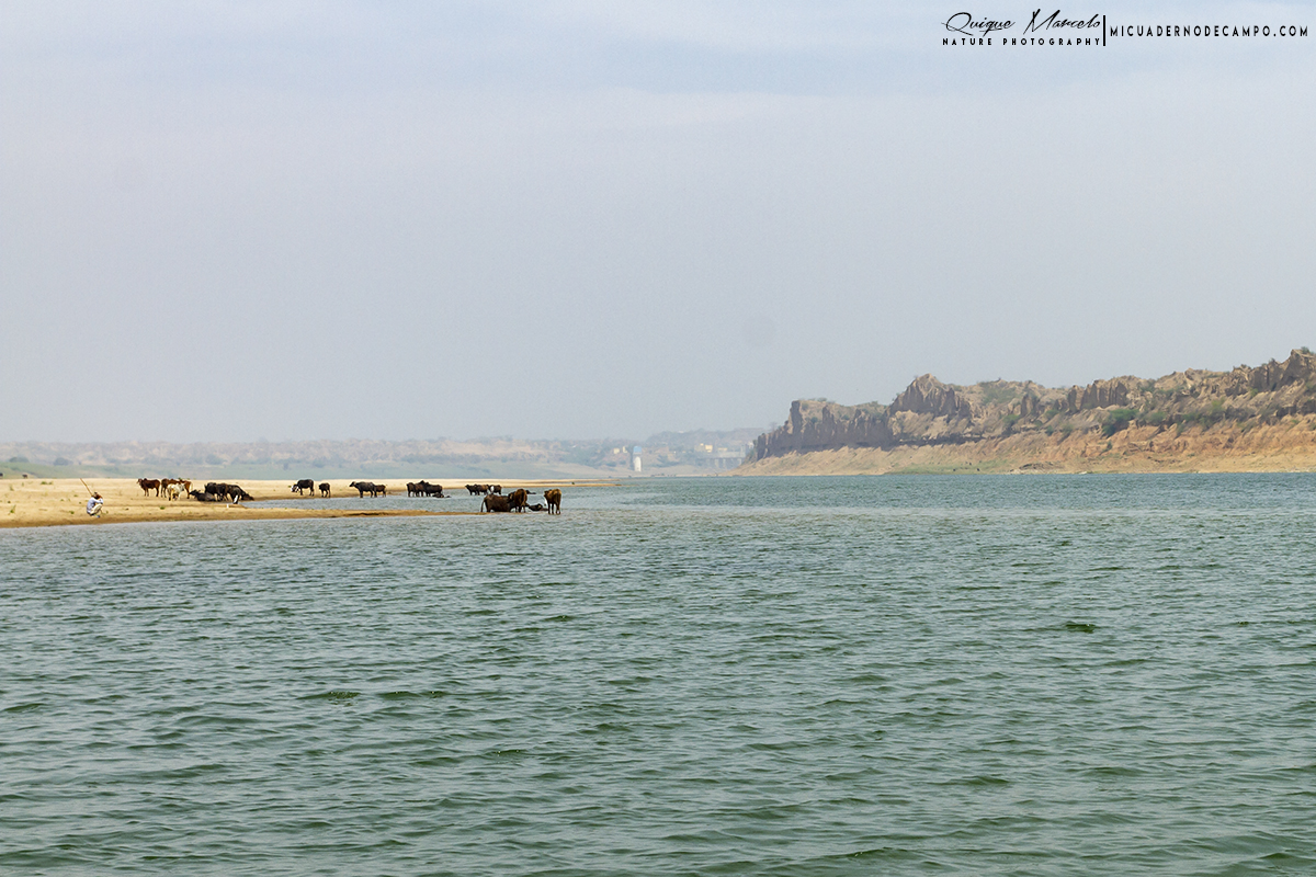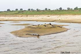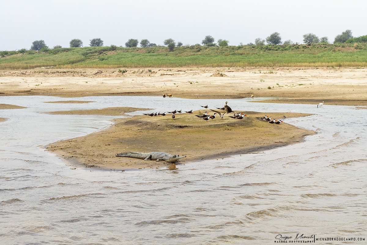 Cuando zarpamos, le comenté a Shyam que le dijera al barquero que se acercara a esa isleta, donde Manolo desde lo alto del puente había visto una especie de alcaraván raro, y bimbo, allí estaba un precioso Alcaraván picogrueso indio (Esacus recurvirostris). Durante las dos horas que duró el tour, fuimos viendo todos esos objetivos que teníamos marcados para el día. El primero había sido el alcaraván, nada más salir del muelle de embarque, luego apareció un Charrán ventrinegro (Sterna acuticauda) volando a ras del agua, y más tarde, nos acercaron a una pequeña isla de arena, donde había un buen número de Canastera chica (Glareola lactea), junto a otro nutrido grupo de Rayador indio (Rynchops albicollis). Luego recorrimos una de las orillas del río, y en el cortado que se levantaba delante de nosotros, pudimos ver varios Mochuelo brahmán (Athene brama) en pequeñas oquedades en la pared. De repente Shyam cantó "Gharial, Gharial", y todos miramos hacia donde señalaba, a la otra orilla del ancho río Chambal. a más de 100 metros. Realmente, este era de todos los objetivos que teníamos marcados en el día, uno de los que más ganas tenía de ver, a ese cocodrilo de hocico delgado, como una espada con dientes, llamado en castellano Gavial (Gavialis gangeticus).