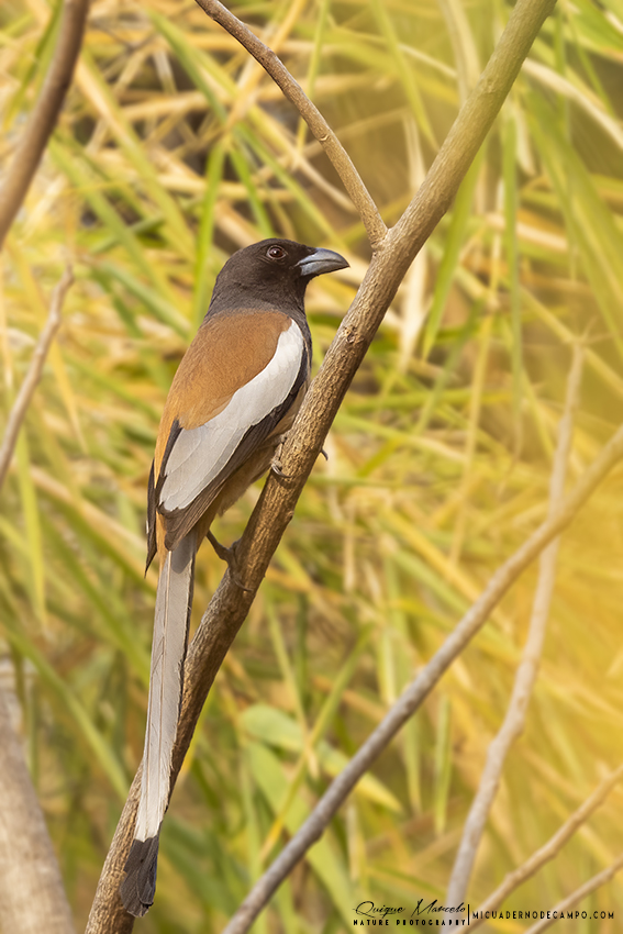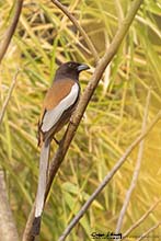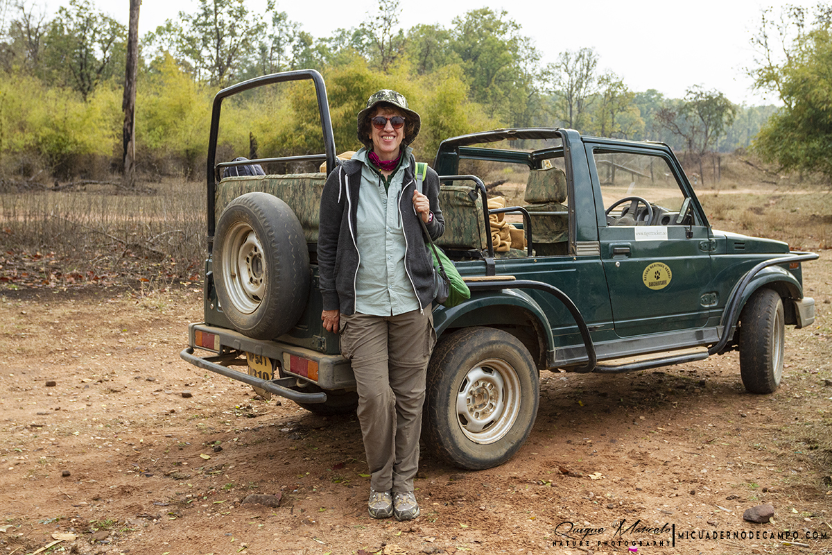 La gran aventura va a empezar, estamos en Bandhavgarh, la tierra del Tigre, donde seguro que nos esperan múltiples aventuras que más tarde contar. Eso es lo que pensaba cuando llegamos a ese mítico parque nacional indio. De hecho, sólo pensar que este parque nacional, junto al de Kahna, fueron las piedras angulares donde se inspiró Rudyard Kipling para escribir "El libro de la selva", ya vale pararse un momento y soñar un poco. A las 5:30 de la mañana nos despiertan con un té con galletas que nos llevan a la habitación. Como dice Guille, esto es un lujo asiático. A las 6:00 estamos todos nosotros en un jeep descapotable, junto con Sanjib y el conductor. Antes de entrar al parque paramos en el centro de visitantes para recoger al ranger que nos han asignado. Un ranger tiene que viajar en cada uno de los 21 jeeps que pueden entrar cada jornada al parque. Eran las 7 de la mañana cuando, por fin, entramos. Bandhavgarh es un parque con grandes valles que recorren amplios ríos y con una extraordinaria fauna, donde la estrella es, como no, el Tigre de Bengala (Panthera tigris), aunque el número de mamíferos es bastante alto, con varias especies diferentes de cérvidos y multitud de aves. En la primera parte del tour, buscamos con ahínco al "gran gato", aunque no hubo suerte, pero sí aparecieron otros mamíferos como Chacal dorado (Canis aureus), Meloncillo rojo (Herpestes smithii), Jabalí (Sus scrofa cristatus), Chital (Axis axis), etc. Entre las aves, vimos un gran número de Turdoide matorralero (Turdoides striata), muy abundante, además de Malcoha sirkir (Taccocua leschenaultii infuscata), un ave difícil de encontrar, Alcaudón pardo (Lanius cristatus), Drongo de raquetas grande (Dicrurus paradiseus rangoonensis), Pavo real común (Pavo cristatus) y Abanico cejiblanco (Riphidura aureola), entre otros.