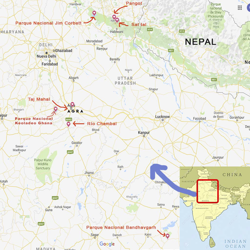 Si hay un país en el mundo lleno de contrastes, con una espectacular mezcla de gente, culturas, colores, olores, tradiciones, vistosos atuendos, etc., ese es India. Si hay un país en el mundo con una fauna descomunal, con más de 1100 especies diferentes de aves, más de 400 especies de mamíferos, por no hablar de anfibios, reptiles, mariposas, etc., ese es India. Por todos estos motivos, ¿Cómo decir no a un viaje tan atractivo como es el Subcontinente Indio?, donde se puede ver en alguno de sus emblemáticos parques nacionales al felino más grande del mundo, el Tigre de Bengala (Panthera tigris), además de cientos de pájaros, en muchas ocasiones, con llamativos colores que no dejan a nadie indiferente. Porque hay que recordar que, a pesar de ser el segundo país del mundo más poblado, con unos 1300 millones de habitantes, y la presión que ejerce toda su población sobre la naturaleza, India es uno de los países del mundo que tiene tal biodiversidad, que lo hace irresistible para cualquier persona en busca de naturaleza salvaje con buenas opciones de fotografía. Hemos recorrido un territorio ínfimo de lo que es el total de la India, con 3287 millones de km2 de extensión, más de seis veces España, pero como es lógico, se necesitaría mucho tiempo para recorrerlo en su totalidad. Los lugares que visitamos fueron el Parque Nacional de Keoladeo Ghana y el río Chambal en el estado de Uttar Pradesh, luego viajamos al centro del país, al estado de Madhya Pradesh, donde se encuentra el Parque Nacional de Bandhavgarh, y por último, visitamos el norte del país, muy cerca de la cordillera del Himalaya, en el estado de Uttarakhand, donde se encuentran el Parque Nacional de Jim Corbett, Pangot y Sattal. El viaje ha sido todo un éxito con un total de 304 especies diferentes de aves vistas, y en su mayoría fotografiadas, 19 especies de mamíferos, y otras tantas de anfibios y reptiles. Pero todo esto no habría sido posible sin la ayuda de nuestro guía nepalí Sanzeev Acharya, un gran conocedor de todas las especies de India y Nepal, que con mucho esmero y dedicación nos iba descubriendo para nosotros, con lo cual, si viajais a India o Nepal, no lo dudéis, contactar con Sanzeev Acharya porque es, sin duda, un gran guía y una persona que se puede confiar perfectamente, saldréis encantados. Os dejo algunos datos útiles que pueden servir a futuros visitantes al país: - ALOJAMIENTOS - CLIMA - SEGURIDAD - SEGURO DE VIAJE - TRANSPORTE - COMIDAS - PRECAUCIONES SANITARIAS - DIFERENCIA HORARIA - MONEDA Y CAMBIO A EUROS Como en crónicas anteriores que he escrito, están separadas las fotos de animales en otra página diferente, la cual, se puede acceder desde este enlace: MAPA DE LA INDIA |