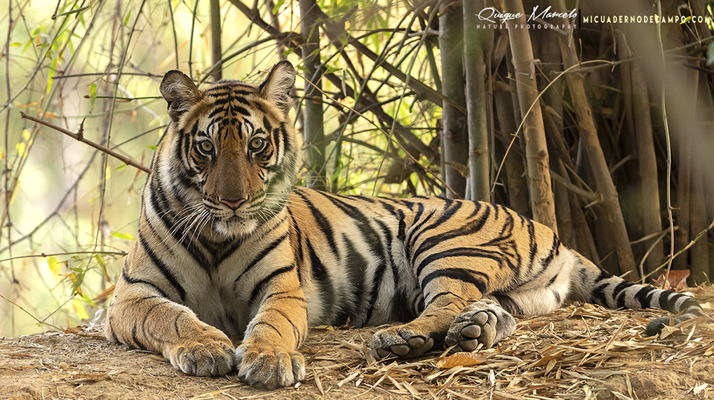Pudimos ver con relativa facilidad, Langur de Jánuman (Semnopithecus entellus), Tórtola moteada occidental (Spilopelia suratensis), Papamoscas de Tickell (Cyornis tickelliae), Trepador indio (Sitta castanea), Prinia de Hodgson (Prinia hodgsonii), Pico crestipardo (Dendrocopos nanus), Mosquitero siberiano (Phylloscopus tristis) y Cálao gris indio (Ocyceros birostris), por nombrar algunos. El almuerzo fue a las 13:30 horas y después, Sanjib nos llevó a buscar pájaros en las inmediaciones del lodge, aunque la suerte no nos acompañó, ya que, una gran tormenta se echó encima sobre las 16:30 y tuvimos que volver rápido perdiendo más de hora y media de pajareo, aun así, pudimos ver Oruguero de Macé (Coracina macei), Cotorra cabeciazul (Psittacula cyanocehala), Vencejo arborícola coronado (Hemiprocne coronata), por cierto, una chulada de pájaro, Minivet chico (Pericrocotus cinnamomeus), Carraca india (Coracias benghalensis), Urraca vagabunda (Dendrocitta vagabunda), Ceniciento chico (Tephrodornis pondicerianus), Colirrojo tizón de la subespecie rufiventris (Phoenicuros ochruros rufiventris), etc. Descansamos bien esa lluviosa tarde, cenamos pronto y fuimos a la cama, que al día siguiente había que levantarse pronto para ir a buscar al felino más grande del planeta... |
