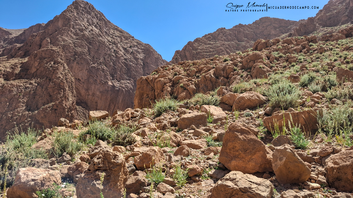 Arrancamos el día bien temprano, con el despertador sonando a las 5:30. Una hora más tarde, dejamos atrás el Jad Auberge y el verde Valle de Ourika. Hoy comienza nuestra transición hacia el sureste, rumbo a Boumalne Dades, con varias paradas estratégicas para seguir sumando especies clave del viaje. La primera parada es el bosque de Toufliht, un pinar de montaña con ambiente fresco y silencioso. Aquí conseguimos ver al siempre activo Herrerillo canario (Cyanistes teneriffae) y a varios Reyezuelos listados (Regulus ignicapilla) entre unos arbustos buscando comida. Un inicio tranquilo que nos sirve para desperezarnos y ponernos en modo alerta para lo que está por venir. Más adelante, desde la carretera, descubrimos un pueblecito pequeño llamado Argnanou, un sitio no señalado en eBird pero que intuimos como prometedor. Y no defrauda. Aquí conseguimos por fin uno de los objetivos pendientes, el Zarcero bereber (Iduna opaca), además de un precioso Escribano sahariano (Emberiza sahari), varios Bulbules naranjeros (Pycnonotus barbatus) y Pinzones magrebíes (Fringilla spodiogenys). Todo ello, en un entorno inesperado y mágico. Nuestra siguiente parada es breve, en un pequeño bosquete junto a la N-9, donde detectamos un Pico picapinos (Dendrocopos major) y un Zorzal charlo (Turdus viscivorus), que se deja ver en el suelo con ceba en el pico, seguramente para sus pollos que no deben andar lejos. Pero el momento más impactante del día ocurre en el pueblo de Aguelmouss. En apenas 20 minutos, conseguimos observar al escurridizo Pito bereber (Picus vaillantii), junto a un Papamoscas gris (Muscicapa striata) y un inquieto Colirrojo tizón (Phoenicurus ochruros). Justo cuando pensábamos que nada podía mejorar, presenciamos una escena inolvidable: un Águila real (Aquila chrysaetos) lanza un ataque relámpago sobre una grajilla. Aunque no logra capturarla, la potencia del lance nos deja literalmente paralizados. Un espectáculo salvaje y fascinante. Ya en el tramo final del día, visitamos el embalse de Ouarzazate, donde el paisaje se vuelve más seco y abierto. Aquí, las aves propias de zonas áridas comienzan a hacerse presentes. Avistamos una Collalba desértica (Oenanthe deserti), también, Terrera sahariana (Ammomanes cinctura), otro Zarcero bereber (Iduna opaca), y un bonito Alzacola rojizo (Cercotrichas galactotes), aunque se encuentra algo lejos para la foto. Finalmente, llegamos sobre las 20:15 al Riad Dades Birds, nuestro alojamiento en Ifri, un pueblo cercano a Boumalne Dades, gestionado por la familia de Brahim Mezane. Con él hemos organizado dos salidas clave: la de mañana por Tagdilt Track y otra posterior en el desierto de Merzouga, el día 28. Cerramos este intenso y fructífero día con una cena reparadora, una ducha rápida y directos a la cama, soñando ya con las aves esteparias del sur. |