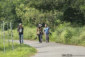 Salimos de nuevo a las 15:30, hora que habíamos quedado de nuevo con Sanjib para ir a visitar un templo budista cercano, llamado Ramdhuni, pero antes, fuimos a visitar a sus padres en una corta visita de 10 minutos, ya que llevaba más de 3 meses sin verlos por su nuevo trabajo en Katmandú, y más tarde, visitamos una colonia de Tejedor baya (Ploceus philippinus) que había en el jardín de una de las casas de su pequeña ciudad. He de decir que el calor en esta época del año es totalmente agobiante, con una humedad relativa en el aire altísima, por tanto, llegábamos tanto en la mañana como en la tarde con la camiseta empapada. Es lo malo de visitar Nepal en esta época del año, porque en las zonas de menos altura del país, o sea, en el sur, el calor en algunas ocasiones es sofocante, sin embargo, en el norte se dan temperaturas mucho más bajas, recordemos que en el norte de Nepal se encuentra la cordillera del Himalaya con 8 de los 14 ochomiles, las montañas más altas del planeta. Volviendo a nuestra visita al templo, allí pudimos disfrutar no sólo de la construcción y de la rica cultura budista que se masca en todas partes de aquel recinto, sino también de la naturaleza y los animales que allí están, como un nutrido grupo de Macaco reshus (Macaca mulatta), con los que Iris disfrutó mucho. Sanjib y Dinesh estaban a lo suyo, no se le escapaba ni un sólo pájaro de los que se movían por los alrededores, como un precioso Abejero oriental (Pernis ptilorhynchus orientalis) que descubrieron en un árbol de los jardines de ese templo, u otros tantos que localizamos en un paseo por los caminos aledaños, como Carraca oriental (Eurystomus orientalis calonyx), Cuco chikra (Hiroccoccyx varius), Abejaruco esmeralda oriental (Merops orientalis beludschicus), Avefría malabar (Vanellus malabaricus), Marabú menor (Leptoptilos javanicus), Garceta intermedia (Ardea intermedia), etc,. También pudimos ver un buen grupo de Langur de Terai (Semnopithecus hector), y en cuanto a reptiles Agama versicolor (Calotes versicolor). Para terminar el día volvimos de nuevo al río Koshi, donde fotografiamos la puesta de sol, para más tarde dirigirnos al lodge. Ducha, cena y a dormir.