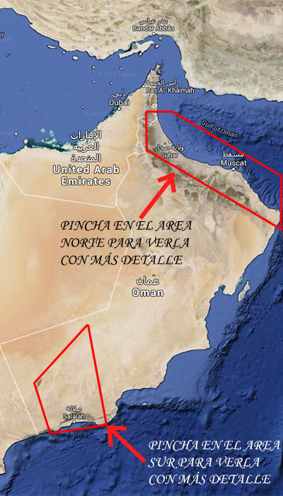 El viaje lo dividimos en dos partes, la primera estuvimos 4 de los 10 días que disponíamos en la zona norte del país, y los 6 días restantes estuvimos en la zona sur. Pinchando sobre las áreas marcadas en el mapa de la derecha se puede ver con más detalle los lugares que visitamos. Viajamos con la compañía Qatar airways hasta Muscat, capital de Omán, con escala en Doha (capital de Qatar) y tomamos otro avión de ida y vuelta para desplazarnos de Norte a Sur con la compañía Omán air. Para desplazarnos por el país, alquilamos un coche grande en cada área con la compañía Europcar a través de un intermediario (rentalcars.com) y aunque un poco apretados, sobretodo porque en ambos maleteros no cabían todas las maletas, nos dieron un muy buen resultado. El total de especies observadas fueron 179, de las cuales, 96 de ellas, tal y como he comentado antes, son difíciles o casi imposible de poder observar en la península ibérica, y 51 de ellas, han sido "bimbo" para mí, o sea, las he observado por primera vez. Dicho esto, comentar que Omán es un excelente y seguro país, donde tienen un buen nivel de vida y una gente amable, cordial y siempre dispuesta a ayudarte y hablar contigo. La moneda es el Rial omaní, moneda que no cotiza en nuestro país y que cuando tuvo lugar nuestro viaje se cambiaba aproximadamente 1 Rial = 2,3 Euros (1 Euro = 0,43 Riales). Otros detalles a tener en cuenta son: A LA DERECHA UN MAPA DE LOS SITIOS QUE VISITAMOS AL DETALLE |