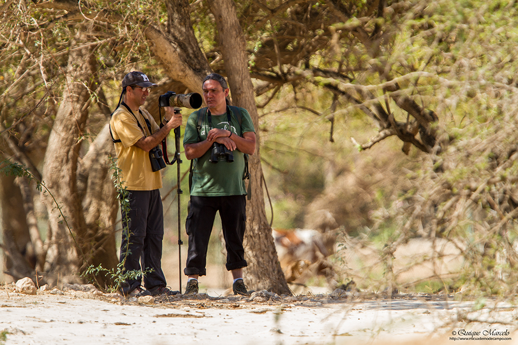 Empezamos el día yendo a un lugar que terminó siendo uno de los mejores lugares de nuestra visita al Sur de Omán, East Khawr, aunque muy presionado por las construcciones aledañas. Llegamos a un camino lineal que separa el mar con el khawr y es impresionante como está la zona, repleta de aves, Cerceta carretona (Anas querquedula), Aguja colinegra (Limosa limosa), Garcilla india (Ardeola grayii), Agachadiza común (Gallinago gallinago), Garceta intermedia (Egretta intermedia), Garceta grande (Egretta alba), Ánade rabudo (Anas acuta), Combatiente (Philomachos pugnax), Correlimos menudo (Calidris minuta), Correlimos tridáctilo (Calidris alba), Correlimos común (Calidris alpina), Archibebe común (Tringa totanus), Chorlitejo patinegro (Charadrius alexandrinus), Chorlito gris (Pluvialis squatarola), Lavandera cetrina (Motacilla citreola), etc. Tras la visita al East Khawr nos fuimos a un área en el interior llamada Tawi Atayr, lugar donde se encuentra una población de Serín del Yemen (Crithagra menachensis), siendo ésta, la población más cercana de cría de esta especie hasta ahora conocida, a más de 1000 Km de las poblaciones existentes en Yemen. Esta población fue descubierta a finales de los 90 y fue una gran sorpresa para los ornitólogos, ya que, se pensaba que el pájaro no existía fuera del territorio de Yemen y suroeste de Arabia. La verdad, llegamos un poco tarde, nos habíamos entretenido mucho en el East Khawr, también con un Zorro rojo (Vulpes vulpes) que nos cruzó por la carretera, algo más tarde nuestro entretenimiento fueron 3 Águilas cafre (Aquila verreauxii) que nos encontramos coronadas en lo más alto en el camino subiendo un puerto de montaña, impresionante rapaz, y más tarde con una joven Águila imperial oriental (Aquila heliaca), un Busardo moro (Buteo rufinus) y un Águila azor perdicera (Aquila fasciatus) que pasaron volando en una parada que hicimos. Por todo ello, llegamos sobre las 12:00 horas a Tawi Atayr, con un calor de justicia. Pensé que los serines iban a ser fáciles, ya que estaban muy localizados en los alrededores de un gran agujero, llamado Sink hole, pero solamente conseguí ver 3 pasando volando y reclamando por delante de mis narices en más de 2 horas de búsqueda. Aparte de los difíciles serines, logramos ver allí Monarca colilargo africano (Terpsiphone viridis), Anteojitos abisinio (Zosterops abyssinicus), Escribano canelo (Emberiza tahapisi) y estriolado (Emberiza striolata), Tórtola senegalesa (Streptopelia senegalensis), Vinago Waalia (Treron waalia), Gavilán común (Accipiter nisus), Estornino de Tristram (Onychognathus tristramii), Collalba árabe (Oenanthe lugentoides) y dentro del impresionante agujero del Sink hole, Paloma bravía (Columba livia). Asados de calor, nos dirigimos al Wadi Marbat, un impresionante valle que le recorre un gran arroyo, donde estaban sumergidos los Dromedarios (Camelus dromedarius) comiendo las algas del fondo. Allí vimos Monarca colilargo africano (Terpsiphone viridis), Colinegro común (Cercomela melanura), Alcaudón isabel (Lanius isabellinus), Papamoscas papirrojo (Ficedula parva), Águila pescadora (Pandion haliaetus), Archibebe claro (Tringa nebularia), Fumarel cariblanco (Chlidonias hybrida), Garza real (Ardea cinerea), Garceta común (Egretta garzetta), Vinago Waalia (Treron waalia), etc. De allí nos fuimos a Taqah a comer en un restaurante un pollo con arroz unos, y un impresionante pescado otros, todo ello aderezado con picantes salsas. La verdad resultó estar muy rico todo. El último lugar que elegimos este día fue el Khawr Rawri, un lugar idílico, de fotografía, con muchísimas aves, aunque tan extenso que todas quedaban muy lejos. Jacana colilarga (Hydrophasianus chirurgus), Archibebe fino (Tringa stagnatilis), Porrón pardo (Aythya nyroca), Gaviota picofina (Chroicocephalus genei), Morito común (Plegadis falcinellus), Espátula común (Platalea leucorodia), Roquero solitario (Monticola solitarius), Bisbita campestre (Anthus campestris), etc., fueron algunas de las muchas aves que pudimos observar allí. Como los últimos días, dormimos en Al Nile Hotel. |