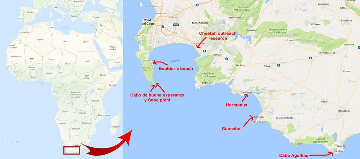 | Vuelta a Cape town desde Gaansbai pasando por Hermanus y Cheetah ouotreach research |