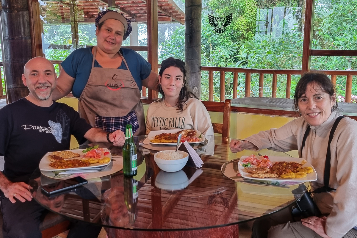 El sonido del despertador a las 5:30 de la mañana marcó el inicio de otro día emocionante en nuestro viaje. Aunque esta vez tuvimos que dormir en cabañas separadas, que estaban tan cerca una de otra que se podía oir claramente el despertador de la otra habitación. Nuestro destino para el día era el Sendero Jumandy, ubicado a unos 50 km de Río Quijos. Con el desayuno preparado para llevar, nos apresuramos a tomar un rápido café antes de emprender el camino. Al llegar al sendero, nos esperaban aves como Cacique montano (Cacicus chrysonotus), Chara turquesa (Cyanolyca turcosa) o Tangara montana (Buthraupis montana), entre otros. Comenzamos la caminata de unos 3 km en busca del Peruvian antpitta (Grallaricula peruviana), una especie que esperábamos avistar en este punto del camino. Sin embargo, el camino se tornó más difícil de lo esperado: las piedras resbaladizas y las zonas embarradas dificultaban nuestro avance. A lo largo del sendero, nos encontramos con sorpresas como Tucán piquinegro (Andigena nigrirostris), Mosquero hermoso (Nephelomyas pulcher) y Picamaderos poderoso (Campephilus pollens), entre otros. Después de más de 3 horas de caminata, llegamos al punto donde esperábamos avistar al Peruvian antpitta. A pesar de los esfuerzos de Alex por llamar al ave con su reclamo, pasaron 40 minutos sin éxito. Decidimos entonces regresar al coche y cambiar nuestros planes. El siguiente destino era la Reserva Wayra, en la alta amazonía, pero antes de llegar, Alex nos sorprendió con la oportunidad de buscar al Birro común (Hirundinea ferruginea), una especie que probablemente no tendríamos otra oportunidad de ver. Con entusiasmo, nos dirigimos hacia este nuevo punto. En medio del camino y sobre unos cortados de piedra, finalmente avistamos al hermoso Birro común, que nos permitió capturar numerosas fotografías antes de continuar nuestro viaje hacia la Reserva Wayra, con la satisfacción de haber vivido otro emocionante encuentro con la naturaleza ecuatoriana. Concluida nuestra búsqueda y fotografía del Birro común, finalmente nos dirigimos a la Reserva Wayra, un hermoso lugar que nos recibió con los brazos abiertos. La amable propietaria nos guió por la reserva, mostrándonos los encantos del lugar y colocando bananas y semillas en los comederos dispersos por todo el territorio. En la parte alta de la reserva, tuvimos la oportunidad de fotografiar varias especies de Tangara, como la preciosa Tangara urraca (Cissopis leverianus), Tangara palmera (Thraupis palmarum), Tangara picoplata (Ramphocelus carbo), así como diferentes tipos de colibríes que revoloteaban entre las flores, como Amazilia listada (Chionomesa fimbriata) , Zafiro colidorado (Chrysuronia oenone), Colibrí pardo (Colibri delphinae), etc. A medida que el día llegaba a su fin, le mencioné a Alex mi deseo de regresar a la Reserva Wayra al día siguiente, ya que percibía que el lugar ofrecía innumerables posibilidades de avistamiento y fotografía de aves. Regresamos a Río Quijos ecolodge después de disfrutar de otro vibrantee día en lugares muy interensantes, y después de una merecida ducha, nos fuimos a cenar y, finalmente, nos retiramos a descansar. |
