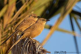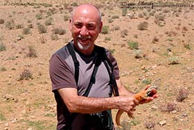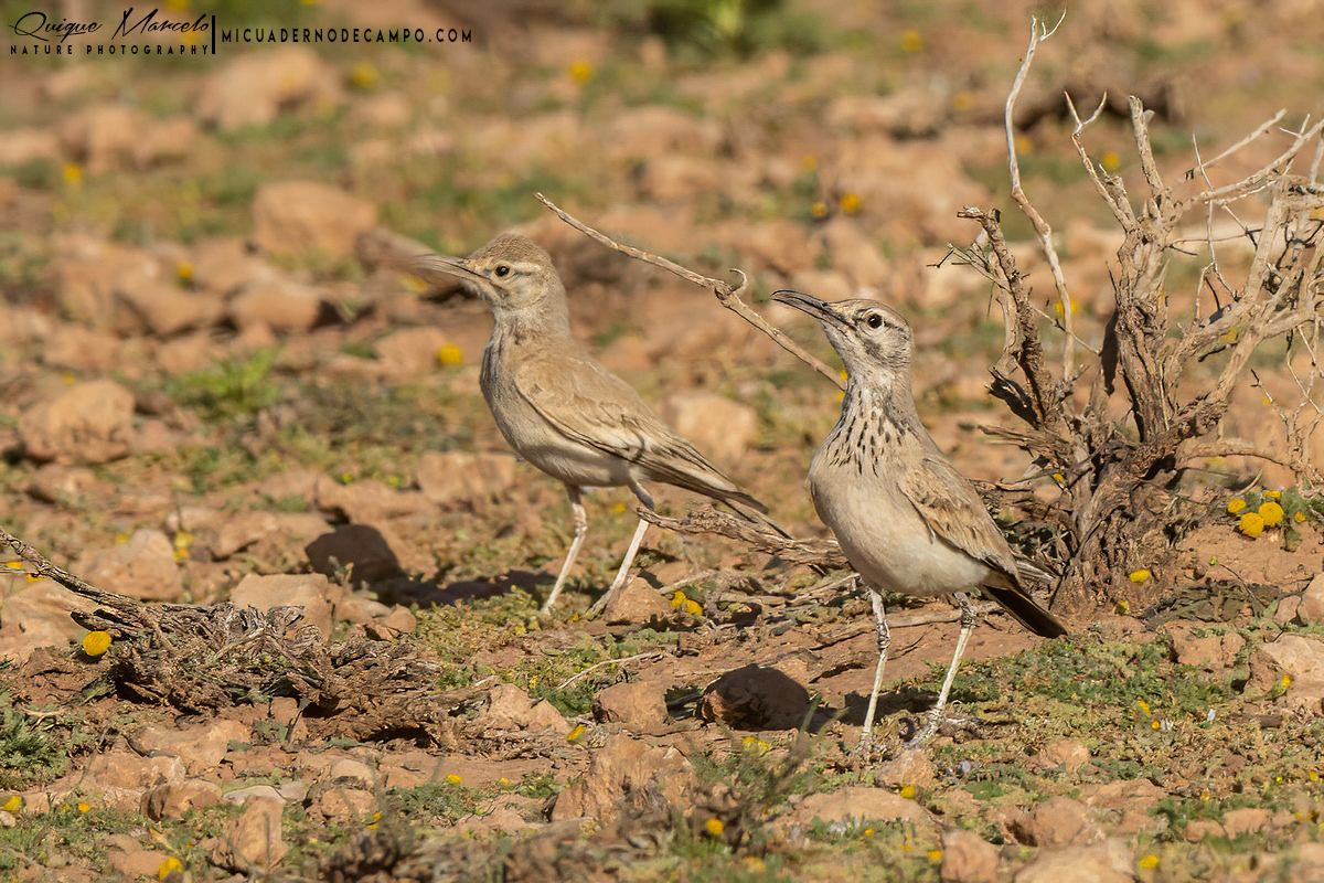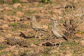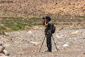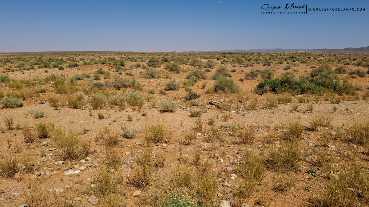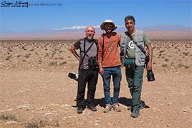 Hoy el día comienza con algo más de calma: el despertador suena a las 7:00, aunque a las 6:40 ya estamos en pie, impacientes por explorar. Nos aseamos y salimos directamente a pajarear por las huertas cercanas al Riad Dades Birds, antes del desayuno. En este paseo matutino, de apenas 35 minutos, disfrutamos de un ambiente fresco y tranquilo en el que destacan Escribano sahariano (Emberiza sahari), el siempre bienvenido Ruiseñor común (Luscinia megarhynchos), Zarcero bereber (Iduna opaca) y algún Pinzón magrebí (Fringilla spodiogenys), especies cada vez más frecuentes en nuestros recorridos. A las 8:00 volvemos al alojamiento para desayunar. Poco después, nos encontramos con Mustapha, primo de Brahim Mezane, quien será nuestro guía para recorrer uno de los enclaves más emblemáticos para las aves esteparias del sur de Marruecos: Tagdilt Track. Accedemos a la pista por la zona del basurero, un lugar tan lamentable como cargado de aves. El contraste entre el vertedero y la belleza del entorno es inevitable: el viento esparce plásticos por doquier, en medio de un espacio clave para la biodiversidad. Sin embargo, la naturaleza resiste. Pronto empezamos a registrar nuestras primeras especies: Collalba culirroja (Oenanthe moesta), Alondra ibis (Alaemon alaudipes), Alondra sahariana (Eremophila bilopha), Cogujada común (Galerida cristata) y otras especies propias del hábitat árido. Nos dirigimos hacia una zona donde Mustapha nos asegura que suele haber buen número de Corredores saharianos (Cursorius cursor), y no se equivoca: localizamos varios ejemplares que nos entretienen durante un buen rato con su andar nervioso y elegante. En otro sector de la estepa, visitamos una zona húmeda temporal donde, aunque no conseguimos ver la esperada concentración de Alondra sahariana (Eremophila bilopha), encontramos un juvenil de Calandria picogorda (Ramphocoris clotbey), además de unos cuantos Sapos norteafricanos (Bufotes boulengeri), así com, varios Lagartos de cola espinosa (Uromastyx nigriventris) que nos regalan un espectáculo inesperado bajo el sol del desierto. Tras una breve parada en un punto donde se pueden observar las dos gangas que se ven en la península (Ganga ibérica y Ganga ortega) sin éxito, nos dirigimos hacia los cortados rocosos en busca del Búho desértico (Bubo ascalaphus). La búsqueda es breve: encontramos un adulto posado en una repisa y, para nuestra sorpresa, también dos pollos ya volanderos. La observación es excelente y las cámaras no paran. En el mismo lugar, disfrutamos de una Collalba núbica (Oenanthe lugens) y un activo grupo de Camachuelos trompeteros (Bucanetes githagineus). Antes de finalizar la ruta, aún registramos una Collaba yebélica (Oenanthe leucopyga) y una Terrera sahariana (Ammomanes deserti). Regresamos al alojamiento para comer, pero la jornada no termina ahí. Por la tarde, Paco y yo volvemos a Tagdilt, decididos a ver con más detalle a la Calandria picogorda (Ramphocoris clotbey) y a la Alondra sahariana (Eremophila bilopha), esta vez buscando ejemplares adultos. La estrategia funciona: logramos observar ambas especies con mejores condiciones, y además, presenciamos brevemente a un Busardo moro (Buteo rufinus cirtensis) alimentándose de una cabra muerta, aunque levanta el vuelo antes de que podamos disfrutarlo plenamente. De vuelta al Riad Dades Birds, cerramos el día con una buena cena y el descanso merecido tras una de las jornadas más completas del viaje. |