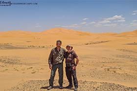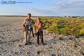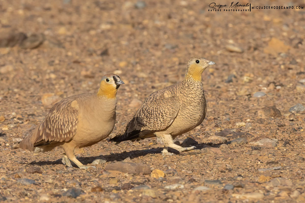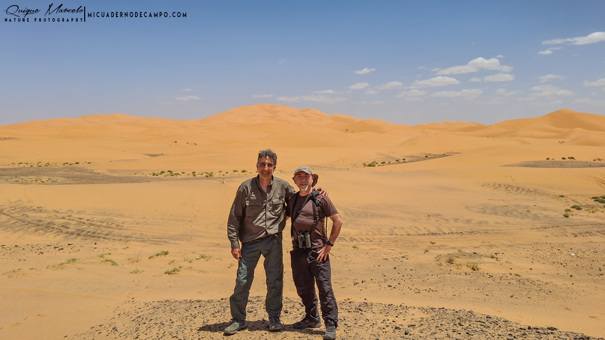 Se repite el mismo ritual mañanero. El despertador suena muy pronto, a las 6:00. Nos aseamos, desayunamos en la habitación con un desayuno que nos ha dejado preparado el chico del alojamiento, y preparamos todo el equipo óptico, ya que a las 7:00 en punto aparece Mohamed, el guía que nos ha asignado Brahim Mezane para realizar el tour por el desierto de Merzouga. Viene acompañado de Said, un conductor experto que maneja su 4x4 como si formara parte del paisaje, sorteando las dunas con habilidad y soltura. El tour tiene una duración prevista de unas 8 horas y desde el inicio se muestra prometedor. Llevamos anotados siete objetivos claros que queremos ver a lo largo del día, y no perdemos tiempo en comunicárselo a Mohamed, quien asiente con seguridad: se los conoce al dedillo. La primera parada nos lleva a una explanada inmensa, un terreno abierto que recuerda al Tagdilt Track, donde hay apenas un charco de un metro cuadrado. Pese a su humildad, sabemos que puede convertirse en escenario de lujo. No olvidemos que es agua en el desierto. Le pedimos a Said que coloque el coche entre el sol y el agua, a escasos metros del borde, para evitar molestar a las aves que están por llegar. No tardamos en tener recompensa: varias decenas de Ganga coronada (Pterocles coronatus) y Ganga moteada (Pterocles senegallus) comienzan a llegar en pequeños grupos. Primero se posan lejos, recelosas, pero poco a poco se van acercando a paso firme y coordinado, como un pequeño ejército. El espectáculo es sencillamente impresionante, uno de esos momentos que se graban para siempre. Con las gangas en el bolsillo, seguimos ruta. Nuestro segundo objetivo es el Gorrión sahariano (Passer simplex). Mohamed nos lleva a un pequeño asentamiento bereber con algunas jaimas y vegetación dispersa. No tarda en aparecer un grupo de gorriones, con su plumaje arenoso y comportamiento confiado. Se dejan observar a placer y conseguimos muy buenas fotografías. Justo cuando nos íbamos, aparece otro guía con un grupo de británicos, entre los que reconocemos a Scott y su hijo. Intercambiamos un breve saludo y seguimos nuestro camino: el reloj no perdona. Ahora buscamos a la esquiva Curruca sahariana (Curruca deserti), más difícil de localizar. Mohamed nos conduce a una zona pedregosa con arbustos dispersos. Aquí toca bajar del coche y caminar. Tras más de una hora de búsqueda infructuosa, Mohamed decide llamar al otro guía, quien nos dice que su grupo está observando la curruca en otro punto. Sin perder un segundo, nos dirigimos hacia allí. Por el camino, se nos cruza varias veces otro de los objetivos del día: la Terrera colinegra (Ammomanes cincturus), que se muestra mucho más confiada, posándose tanto en el suelo como en lo alto de pequeños arbustos, lo que nos permite disfrutarla y fotografiarla con calma. Llegamos finalmente al sitio indicado y allí está: la Curruca sahariana, moviéndose de arbusto en arbusto, nerviosa y ágil, buscando alimento. Nos mantiene ocupados un buen rato, pero conseguimos observarla con detalle y obtener algunas buenas tomas. Es una satisfacción especial, sabiendo lo complicado que es encontrarla. A media jornada, tras un breve descanso, ponemos rumbo a un pequeño oasis donde tienen localizado al Chotacabras egipcio (Caprimulgus aegyptius). El trayecto, de unos 40 minutos, nos lleva a través de zonas pedregosas y dunas. Desde lejos vemos que el grupo de británicos ya ha llegado. Nos tememos lo mejor, y acertamos: uno de los integrantes del grupo nos señala la ubicación exacta. Bajo una pequeña palmera descansan dos adultos y dos pollos perfectamente mimetizados. El camuflaje es tan efectivo que cuesta creer que estén ahí. Permanecen completamente inmóviles, lo que nos permite contemplarlos largo rato sin molestarlos. Nos queda un solo objetivo: el Cuervo desertícola (Corvus ruficollis). Lo localizamos de regreso al campamento, posado en la rama de una acacia solitaria junto a otro ejemplar, protegiéndose del fuerte calor del mediodía. Nos detenemos unos minutos para observarlos, satisfechos de haber logrado ver las siete especies marcadas al inicio del día. Antes de volver al alojamiento, aún nos queda una última parada en el Palmeral de Igrane. Este rincón verde es un verdadero oasis de vida, y no decepciona. Observamos varias especies en plena migración, como el Mosquitero silbador (Phylloscopus sibilatrix), el Mosquitero musical (Phylloscopus trochilus) y la siempre elegante Tórtola europea (Streptopelia turtur). También aparece, para nuestra sorpresa, un Turdoide rojizo (Argya fulva), y es la segunda vez que vemos hoy, ya que donde el Gorrión sahariano, también apareció uno fugazmente. Y creíamos que iba a ser de los más difíciles del viaje, en fin. Por la tarde, tras una comida rápida y algo de descanso, decidimos acercarnos a la laguna de Merzouga. Nos recibe completamente llena de agua, un espectáculo asombroso en medio del desierto. Está repleta de limícolas y otras aves acuáticas que reconocemos fácilmente: Cigüeñuela común (Himantopus himantopus), Correlimos menudo (Calidris minuta), Correlimos zarapitín (Calidris ferruginea), Chorlitejo chico (Thirnonis dubius), Chorlitejo patinegro (Charadrius alexandrinus), Avoceta común (Recurvirostra avosetta) y Tarro canelo (Tadorna ferruginea), entre otras. Con la luz dorada del atardecer envolviéndolo todo, regresamos finalmente al hotel, agotados pero felices. Ha sido una jornada larga e intensa, quizás la más completa del viaje. Tras una ducha reparadora, cenamos en el Tifinagh Guest con una sonrisa de oreja a oreja, sabiendo que el desierto nos ha regalado uno de esos días que no se olvidan nunca. |